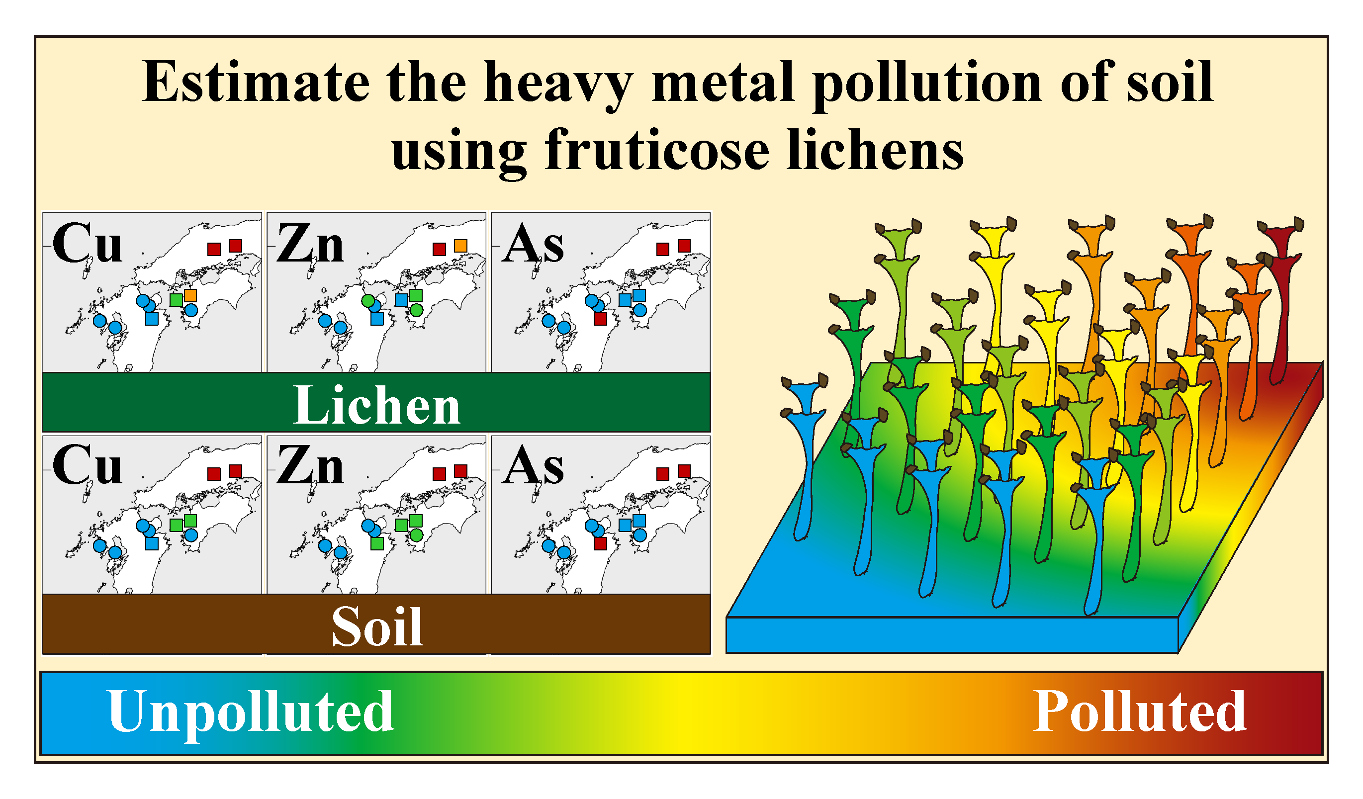 Soil pollution has been estimated using soil analysis and leaching test. These methods could show different data from reality due to effects by soil properties such as grain size and mineral composition. Therefore, this study advocates a new assessment and monitoring method of heavy metal polluted soil using fruticose lichens. Lichens growing at abandoned mine sites and unpolluted areas in southwest Japan and their substrata were analyzed using inductively coupled plasma-mass spectrometry and X-ray fluorescence spectrometry to clarify the relationships between the heavy metal concentrations in lichens and soils, and their heavy metal absorption properties. Concentrations of Cu, Zn, As, and Pb in the lichens were positively correlated with those in the soil. Variability of the relationships did not depend on the lichen species, location, habitat, or the conditions of soils. The analyzed lichens had neither competitive nor antagonistic properties in their heavy metal absorption, which make them good biomarkers of heavy metal pollution of soil. The distribution maps of average heavy metal concentrations at each sampling region detected almost all of the Cu, Zn, and As pollution of soil. Therefore, lichens could be used in practical applications to assess Cu, Zn, and As pollution of soils.