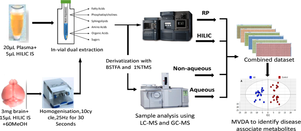 Metabolomic analysis of biological fluids and tissues has become an increasingly routine tool in the biological toolbox. However, challenges remain to be overcome, including developing strategies to maximise coverage of the metabolome without requiring large sample volumes. Here we describe a multimodal strategy that combines data using both LC-MS and GC-MS from a unique vial with a sample of plasma (20µl) or a sample of brain tissue (3mg). Using a split phase extraction the non-aqueous phase was analyzed by reversed phase (RP) LC-MS, whilst the aqueous phase was analyzed using hydrophilic liquid interaction chromatography (HILIC)LC-MS, with both phases also analysed using GC-MS after derivatization of the extract. Analytical performance was assessed in 7 rat cerebellum samples and a pilot study of 40 plasma samples (20 vs. 20: AD vs. healthy controls). The method, which uses four hours of instrument time, measured 20,707 metabolite features in brain samples and 17,266 in plasma samples, from those 44.1% features displayed CV’s below 15% and 75.2% below 30%. The method has potential to resolve subtle biological differences and to correlate metabolite composition directly to clinical outcomes including MMSE, age and ADCS-ADL. This method can acquire in the order of 20K metabolic features when low volumes are available.