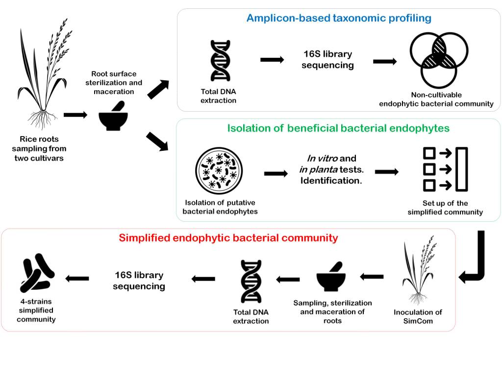 Rice is currently the most important food crop in the world and we are only just beginning to study the bacterial associated microbiome. It is of importance to perform screenings of the core rice microbiota and also to develop new plant-microbe models and simplified communities for increasing our understanding about the formation and function of its microbiome. In order to begin to address this aspect, we have performed the isolation of hundreds bacterial isolates obtained from endorhizosphere of two rice cultivars from Venezuela. The validation of plant-growth promoting bacterial activities in vitro has led us to select and characterize 15 isolates for in planta studies such as germination test, endophytism ability and plant growth promotion. Consequently, a set of 10 isolates was selected for the set-up of an endophytic consortium as a simplified model of the natural rice bacterial endomicrobiota. Upon inoculation, the colonization and abundance of each strain within the rice roots was tracked by a culture-independent technique in gnotobiotic conditions in a 30 days period. Four strains belonging to Pseudomonas, Agrobacterium and Delftia genera have shown a promising capacity for colonizing and coexistence in root tissues. On the other hand, a bacterial community taxonomic profiling of the rhizosphere and the endorhizosphere of both cultivars were obtained and are discussed. This study is part of a growing body of research on core crops microbiome and simplified microbiomes, which strengthens the formation process of the endophytic community leading to a better understanding of the rice microbiome.