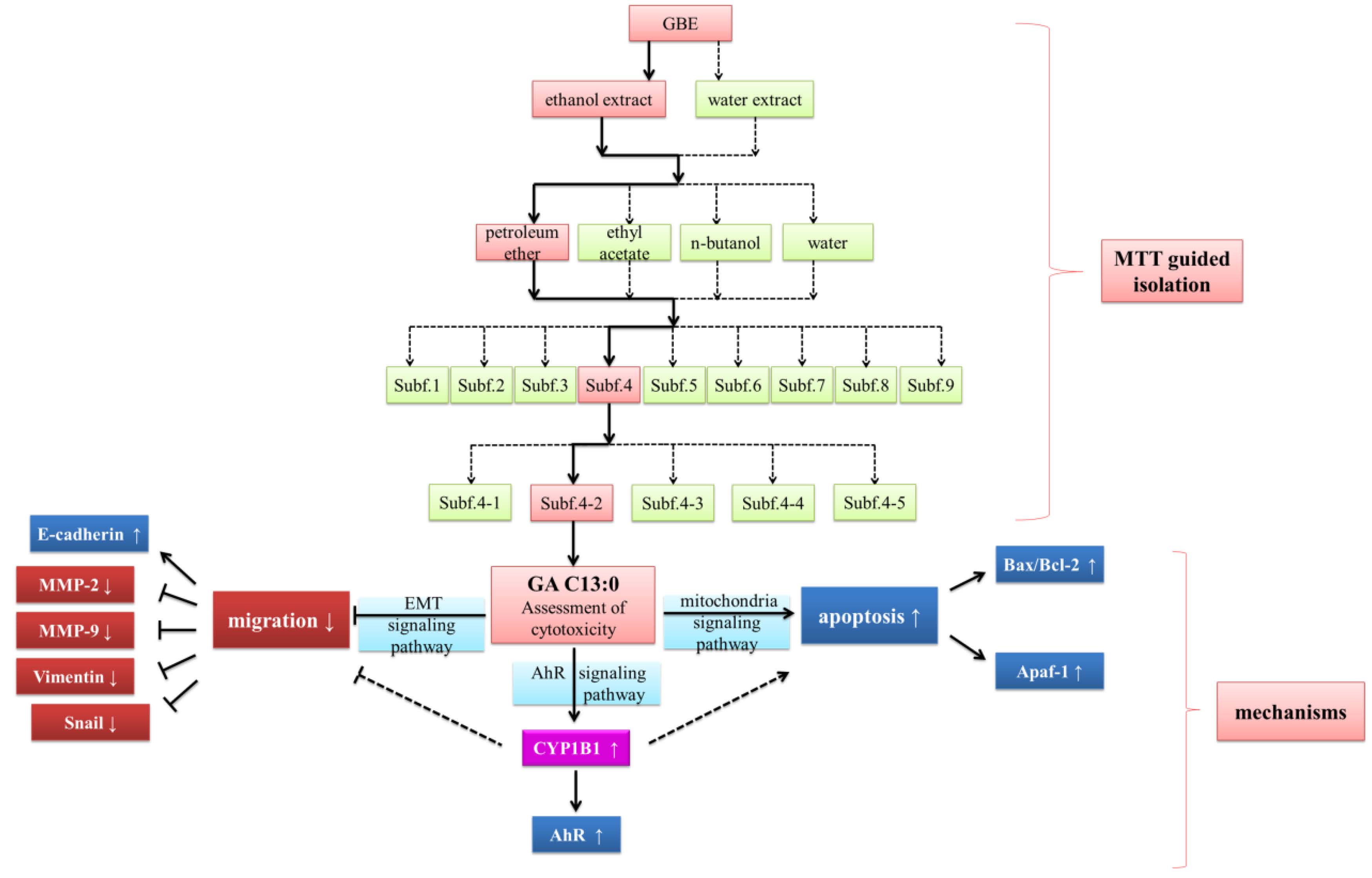 Ginkgolic acids (GA) have been reported to exhibit anticancer properties, however, the mechanisms remain unclear. This study aims to investigate the mechanisms of GA C13:0 that was isolated from Ginkgo biloba exocarp (GBE) for anti-proliferation, pro-apoptosis and anti-migration effects in human MCF-7 and mouse 4T-1 breast cancer cells. The cytotoxic effect, apoptosis induction and migration inhibition were measured using MTT, TUNEL and Wound healing assays. The expression of mRNA and protein were determined using qPCR and Western blot. Our results showed that no cytotoxicity was found at concentrations of C13:0 below 100µM. The effects of GA C13:0 was further demonstrated by up-regulation of the Bax/Bcl-2 apoptosis pathway and the expression of Apaf-1 protein in the mitochondria. In addition, GA C13:0 also suppressed cell migration and epithelial to mesenchymal transition (EMT) with the increase of E-cadherin expression accompanied by the decrease of Snail, MMP-2, MMP-9 and Vimentin expression. Moreover, GA C13:0 induced cytochrome P450 (CYP) 1B1 expression in aryl hydrocarbon receptor (AhR) pathway. Notably, the up-regulation of CYP1B1 also might play a pivotal regulatory role in mitochondrial and EMT pathways in MCF-7 and 4T-1 cells. Our results may have implications for the development of anticancer agents containing GA as functional additives.