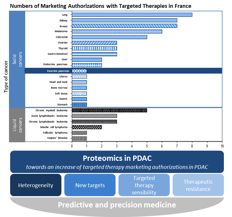 In metastatic pancreatic cancer patients non eligible to surgery, signal-targeted therapies so far failed to show a significant amelioration of survival. These therapeutic options were tested in Phase II/III clinical trials mostly in combination with the reference treatment Gemcitabine. These innovative therapies aim at annihilating the oncogene dependency; they also aim at renormalizing the tumoral stroma to allow immune cell function or re-vascularisation. Transcriptomics and genomics large scale analysis show the great heterogeneity of pancreatic cancers and failed to clearly delineate specific oncogene dependency besides oncogenic Kras. In this review, we will describe the most recent proteomic data in pancreatic tumors and its metastasis, which could help at identifying their major signalling dependencies, as well as explain why they are intrinsically resistant to signal-targeted therapies. We will also discuss why PI3K signalling, as a paradigm of pro-tumorigenic cell signalling and of tumoral adaptative resistance to drugs, is a relevant target in this context.
