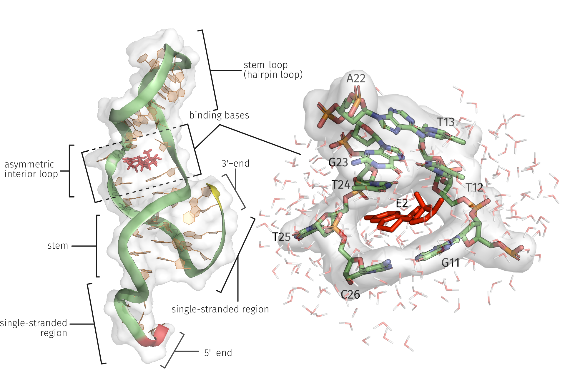 Micro pollutants such as 17β-Estradiol (E2) have been detected in low concentrations in different water resources and their negative effects on the environment and organisms are observed. In this study, a previously described 35-mer E2-specific aptamer was used to investigate the underlying binding characteristics between E2 and the aptamer through an MD simulation in an aqueous medium. There is no 3D structure information for this aptamer, so it was modeled using coarse-grained modeling method. The E2 ligand was positioned inside the potential binding area of the aptamer structure, the underlying complex was used for an 25 ns MD simulation, and the interactions were examined by an interaction profiler tool for each time step. The E2-specific bases of the aptamer had presumably dominant roles in the binding of E2 in terms of the different interaction types. We identified the specific bases within the interior loop of the aptamer and we also demonstrate the influence of oftentimes underestimated water-mediated hydrogen bonds. The study contributes to the understanding of the behavior of ligands binding through aptamer structure in an aqueous solution. The developed workflow allows to generate and examine further appealing ligand aptamer complexes.