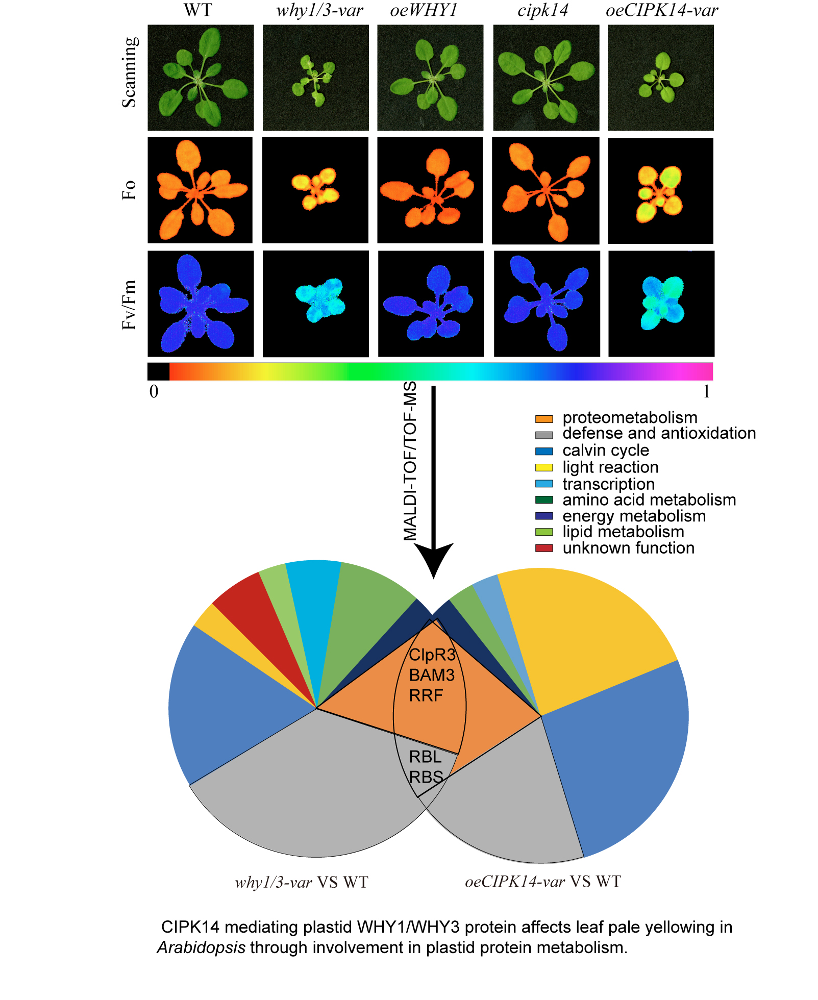 Leaf variegation pale yellowing is observed in the Calcineurin B-Like-Interacting Protein Kinase14 (CIPK14) overexpression line (oeCIPK14) and double knockout WHIRLY1/WHIRLY3 (why1/3) lines of Arabidopsis, the distribution of WHIRLY1 (WHY1) protein between plastids and the nucleus are affected by the phosphorylation of WHY1 by CIPK14. To elucidate the coregulation of CIPK14 and WHIRLY1/WHIRLY3 mediated leaf pale yellowing, a differential proteomic analysis is conducted between the oeCIPK14 variegated (oeCIPK14-var) line, why1/3 variegated (why1/3-var) line and wild type (WT). More than 800 protein spots are distinguished on each gel, 67 differential abundance proteins (DAPs) are identified by matrix-assisted laser desorption ionization-time of flight/time of flight mass spectrometry (MALDI-TOF/TOF-MS), of which, 34 DAPs are in the oeCIPK14-var, 33 DAPs are in the why1/3-var compared to WT. Five overlapping proteins differentially change both in the oeCIPK14-var and in the why1/3-var. They are ATP-dependent Clp protease proteolytic subunit-related protein 3 (ClpR3), Ribulose bisphosphate carboxylase large chain (RBL), Beta-amylase 3 (BAM3), Ribosome-recycling factor (RRF), Ribulose bisphosphate carboxylase small chain (RBS). Bioinformatics analysis show that most of DAPs are involved in photosynthesis, defense and antioxidation pathway, protein metabolism, amino acid metabolism, energy metabolism, malate biosynthesis, lipid metabolism and transcription. Thus, the photosystem parameters are measured that the content of chlorophyll, the photochemical efficiency of PSⅡ (Fv/Fm), and electron transport rates (ETR) decrease in the why1/3-var and oeCIPK14-var, but the non-photochemical quenching (NPQ) increases. Both mutants show high sensitivity to strong light. Based on the annotation of DAPs from both why1/3-var and oeCIPK14-var lines, we conclude that CIPK14 phosphorylation mediated WHY1 deficiency in plastids is related to impairment of protein metabolism leading to chloroplast dysfunction.