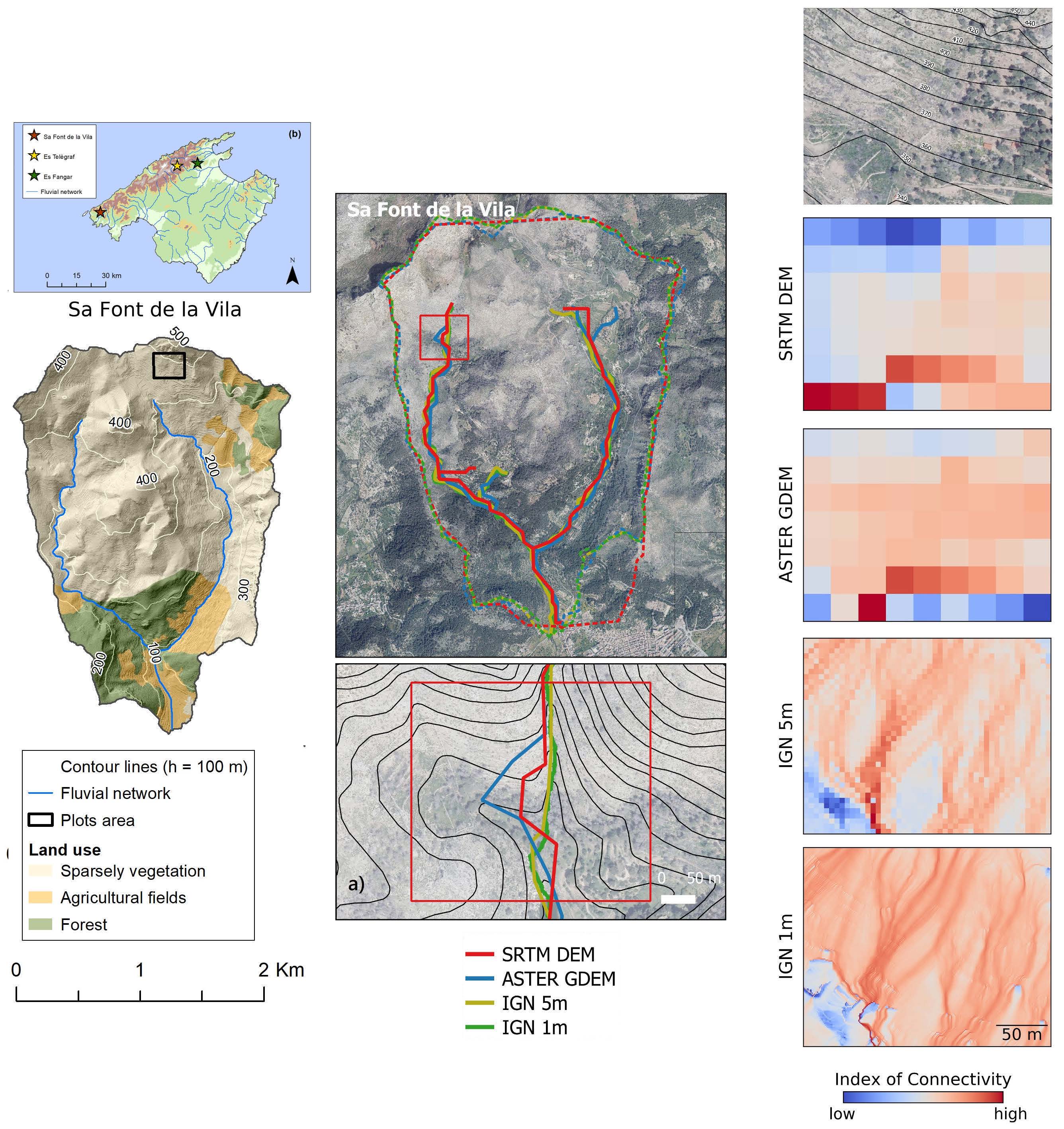 Digital Terrain Models (DTMs) are currently a fundamental source of information in Earth Sciences. However, DTM-based studies can contain remarkable biases if limitations and inaccuracies of these models are disregarded. In this work, four freely available datasets such as SRTM C-SAR DEM, ASTER GDEM V2 and two airborne LiDAR derived DTMs (at 5 and 1 m spatial resolution, respectively) were analysed in a comparative study in three geomorphologically contrasted catchments located in Mediterranean geoecosystems under intensive human land use influence. Vertical accuracy as well as the influence of each dataset characteristics on hydrological and geomorphological modelling applicability were assessed by using classic geometric and morphometric parameters and the more recently proposed index of sediment connectivity. Overall vertical accuracy – expressed as Root Mean Squared Error (RMSE) and Normalized Median Deviation (NMAD) – revealed the highest accuracy in the cases of the 1 m (RMSE = 1.55 m; NMAD = 0.44 m) and 5 m LiDAR DTMs (RMSE = 1.73 m; NMAD = 0.84 m). Vertical accuracy of SRTM was lower (RMSE = 6.98 m; NMAD = 5.27 m) but considerably higher than in the case of ASTER (RMSE = 16.10 m; NMAD = 11.23 m). All datasets were affected by systematic distortions. As a consequence, propagation of these errors caused negative impacts on flow routing, stream network and catchment delineation and, to a lower extent, on the distribution of slope values. These limitations should be carefully considered when applying DTMs for hydrogeomorphological modelling.