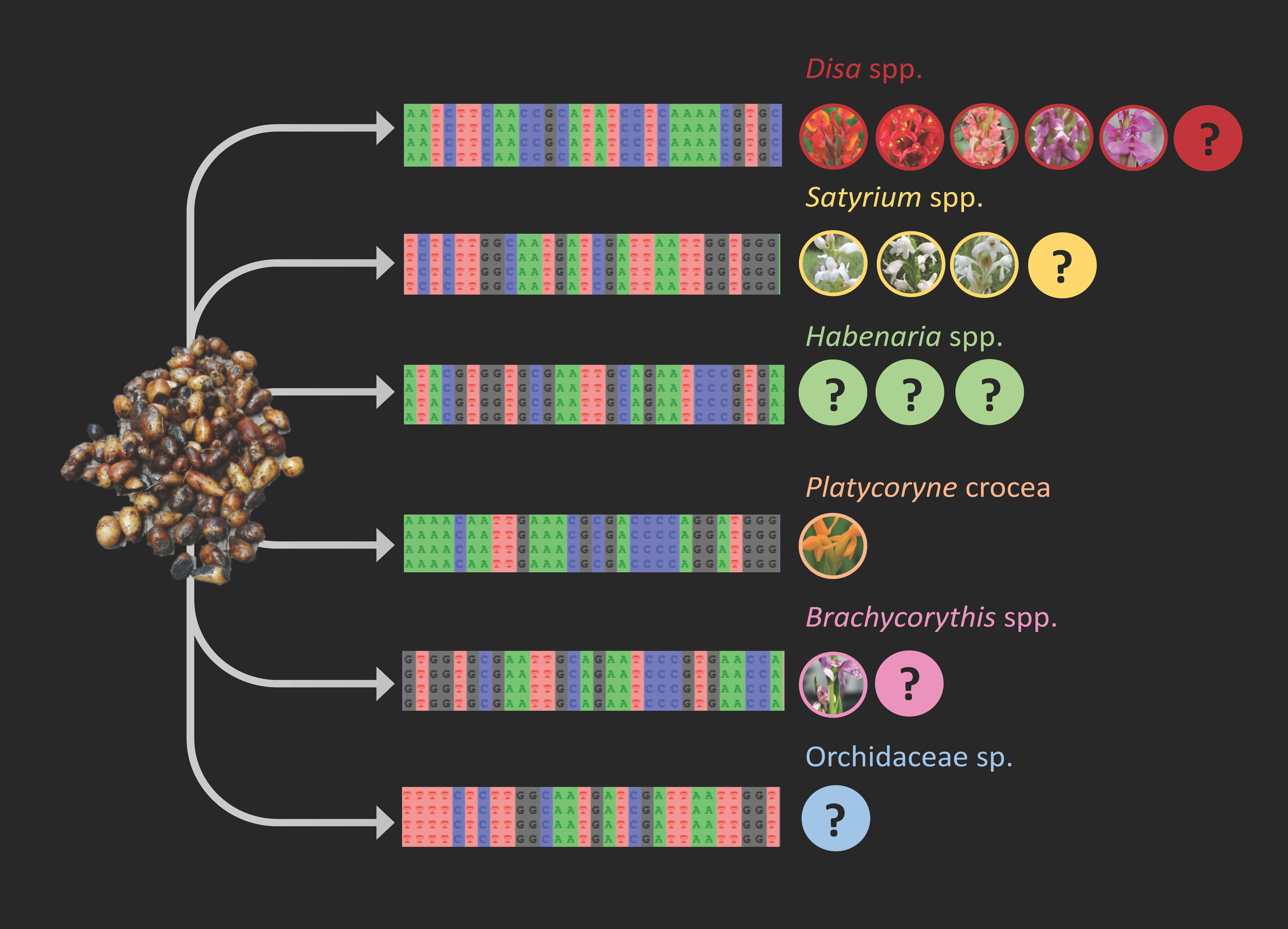 In Zambia wild edible terrestrial orchids are used to produce a local delicacy called chikanda, which has become increasingly popular throughout the country. Commercialization puts orchid populations in Zambia and neighbouring countries at risk of overharvesting. Hitherto, no study has documented which orchid species are traded on local markets, as orchid tubers are difficult to identify morphologically. In this study, the core land-plant DNA barcoding markers rbcL and matK were used in combination with nrITS to determine which species were sold on Zambian markets. Eighty-two interviews were conducted to determine harvesting areas, as well as possible sustainability concerns. By using nrITS DNA barcoding, a total of 16 orchid species in six different genera could be identified. Both rbcL and matK proved suitable to identify the tubers up to genus- or family level. Disa robusta, Platycoryne crocea and Satyrium buchananii were identified most frequently and three previously undocumented species were encountered on the market. Few orchid species are currently listed on the global IUCN Red List. Local orchid populations and endemic species could be at risk of overharvesting due to the intensive and indiscriminate harvesting of chikanda orchids and we therefore encourage increased conservation assessment of terrestrial African orchids.