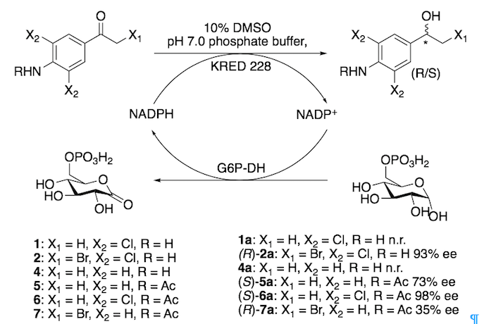 (R)-1-(4-Amino-3,5-dichlorophenyl)-2-bromoethan-1-ol has been synthesised in 93% enantiomeric excess (ee) by asymmetric reduction of the corresponding ketone catalysed by a ketoreductase and NADPH as the co-factor in DMSO. (S)-N-(2,6-Dichloro-4-(1-hydroxyethyl)phenyl)acetamide has been synthesised in >98% ee by the same system. Both synthons are potential precursors for clenbuterol enantiomers. Clenbuterol is a β2-agonist used in veterinary treatment of asthma in several countries. The drug is listed on the World Anti-doping Agency’s Prohibited list due to its effect on increased protein synthesis in the body. However, racemic clenbuterol has recently been shown to reduce the risk of Parkinson’s disease. In order to reveal which one (or both) of the enantiomers that cause this effect, the pure enantiomers need to be studied separately. Our biocatalytic approach in order to obtain enantiopure clenbuterol should be applicable to industrial scale.
