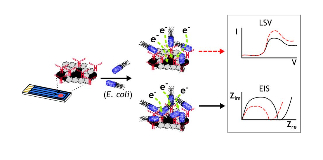 Immunosensors have been widely developed to use antibodies to detect a pathogen of interest; it is interesting to look at the effect of nonspecific antibody binding to E. coli using electrochemical methods. IgG antibody not specific to E. coli O157:H7 was crosslinked onto a screen-printed carbon electrode. The presence of E. coli at 4, 4 × 102, 4 × 105, and 4 × 108 CFU/mL on the electrode surface was detected via linear sweep voltammetry (LSV) and electrochemical impedance spectroscopy (EIS). Current transfer at both electrodes was reduced as the concentration of bacteria increased; however, the calibration of number of cells to decreased current was nonlinear for IgG-modified electrodes. The nonlinearity is confirmed by EIS measurements which showed highest impedance at 4 CFU/mL E. coli when impedance should be the lowest. FESEM images showed higher binding of cells when IgG is present compared to electrodes with reduced graphene oxide (rGO) alone. Electrodes with rGO alone show less attachment of E. coli, with EIS showing a linear calibration profile, while LSV shows not much difference in current values for all concentrations aside from the highest concentration. These results suggest that nonspecific binding can provide false signals in electrochemical measurements, and it is crucial to provide proper controls.