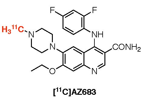 Positron emission tomography (PET) imaging of Colony Stimulating Factor 1 Receptor (CSF1R) is a new strategy for quantifying both neuroinflammation and inflammation in the periphery since CSF1R is expressed on microglia. AZ683 has high affinity for CSF1R (Ki = 8 nM; IC50 = 6 nM) and >250-fold selectivity over 95 other kinases and, in this paper, we report the radiosynthesis of [11C]AZ683 and initial evaluation of its use in CSF1R PET. [11C]AZ683 was synthesized by 11C-methylation of the desmethyl precursor with [11C]MeOTf in 3.0% non-corrected activity yield (based upon [11C]MeOTf), >99% radiochemical purity and high specific activity. Preliminary PET imaging with [11C]AZ683 revealed no brain uptake in rodents and nonhuman primates suggesting that [11C]AZ683 is a poor candidate for imaging neuroinflammation, but that it could still be useful for peripheral imaging of inflammation.