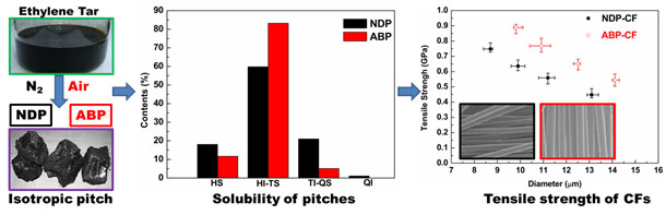 Two isotropic pitches were prepared by air blowing and nitrogen distillation method using ethylene tar (ET) as a raw material. And correspondent carbon fibers were obtained through conventional melt spinning, stabilization and carbonization. The structures and properties of resultant pitches and fibers were characterized and their differences were discussed in this work. The results showed that introduction of the oxygen by air blowing method could quickly increase the yield and softening point of pitch. Moreover, the air blown pitch (ABP) composed of linear methylene chains of aromatic molecules while the nitrogen distilled pitch (NDP) mainly contained polycondensed aromatic rings, which was due to the oxygen containing functional groups existed in ABP could impede order stack of pitch molecules and form methylene bridge structure, instead of aromatic condensed structure like NDP. Meanwhile, the spinnability of ABP was not decreased even containing 2.31 wt% oxygen. In contrast, ABP had narrower molecular weight distribution, which contributed to better stabilization properties and higher tensile strength of carbon fiber. The tensile strength of carbon fibers from ABP was reached to 860 MPa with fiber diameter of about 10 μm, which was higher than that of NDP-derived carbon fibers of 640 MPa.