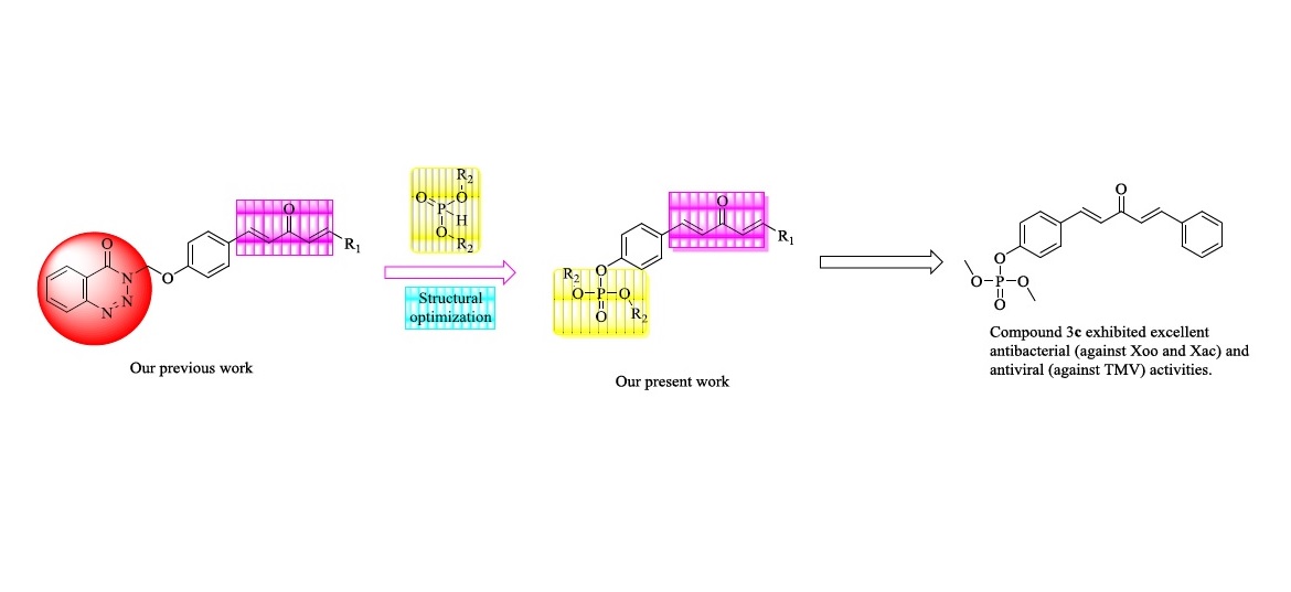 A series of penta-1,4-dien-3-one containing a H-phosphonate scaffold were designed and synthesized. The structures of all title compounds were determined by 1H-NMR, 13C-NMR, 31P-NMR, and HRMS. Bioassay results showed that several of the title compounds exhibited remarkable antibacterial and antiviral activities. Among these, compounds 3c and 3o exhibited substantial antibacterial activities against Xanthomonas oryzae pv. Oryzae (Xoo) and Xanthomonas axonopodis pv. citri (Xac). In addition, compounds 3c, 3f, and 3r showed remarkable curative activities against tobacco mosaic virus (TMV), with 50% effective concentration (EC50) values of 290.0, 234.0, and 373.6 μg/mL, respectively. These were superior to that of ningnanmycin (386.2 μg/mL). Compound 3r exhibited comparative protective activity against TMV, with an EC50 value of 291.1 μg/mL, which was better than that of ningnanmycin (297.1 μg/mL). Notably, the solubility of all title compounds improved relative to the lead compound curcumin. These results suggest that penta-1,4-dien-3-one containing a H-phosphonate scaffold may be considered as an activator for antibacterial and antiviral agents.