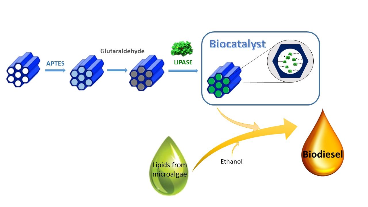 The production of fatty acids ethyl esters (FAEEs) to be used as biodiesel from oleaginous microalgae shows great opportunities as an attractive source for the production of renewable fuels without competing with human food. To ensure the economic viability and environmental sustainability of the microbial biomass as a raw material, the integration of its production and transformation into the biorefinery concept is required. In the present work, lipids from wet Isochrysis galbana microalga were extracted with ethyl acetate with and without drying the microalgal biomass (dry and wet extraction method, respectively). Then, FAEEs were produced by lipase-catalyzed transesterification and esterification of the extracted lipids with ethanol using lipase B from Candida antarctica (CALB) and Pseudomonas cepacia (PC) lipase supported on SBA-15 mesoporous silica functionalized with amino groups. The conversion to FAEEs with CALB (97 and 85.5 mol% for dry and wet extraction, respectively) and PS (91 and 87 mol%) biocatalysts reached higher values than those obtained with commercial Novozym 435 (75 and 69.5 mol%). Due to the heterogeneous nature of the composition of microalgae lipids, mixtures with different CALB:PC biocatalyst ratio were used to improve conversion of wet-extracted lipids. The results showed that a 25:75 combi-lipase produced a significantly higher conversion to FAEEs (97.2 mol%) than those produced by each biocatalyst independently from wet-extracted lipids and similar ones than those obtained by each lipase from the dry extraction method. Therefore, that optimised combi-lipase biocatalyst, along with achieving the highest conversion to FAEEs, would allow improving viability of a biorefinery since biodiesel production could be performed without the energy-intensive step of biomass drying.