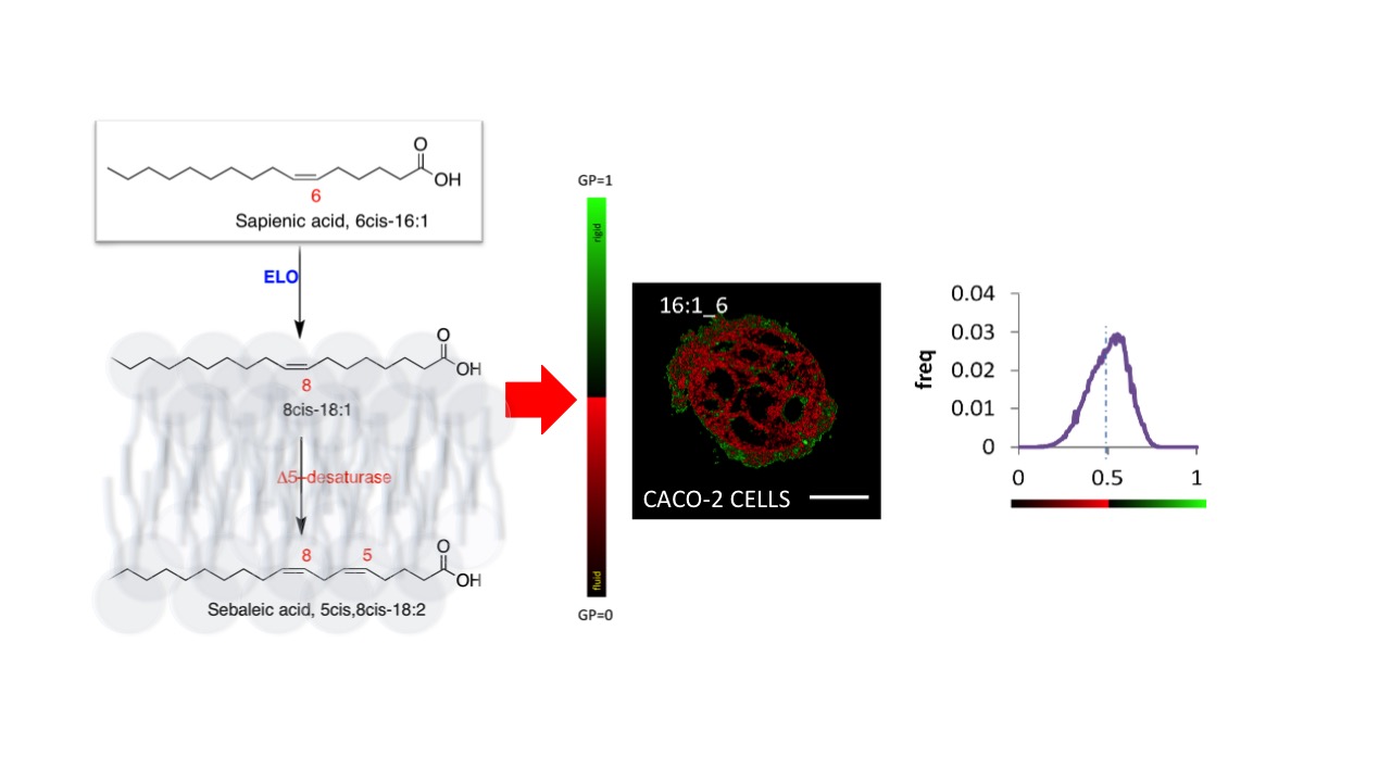 Palmitic acid metabolism involves delta-9 and delta-6 desaturase enzymes forming palmitoleic acid (9cis-16:1; n-7 series) and sapienic acid (6cis-16:1; n-10 series), respectively. The corresponding biological consequences and lipidomic research on these positional MUFA isomers are under development. Furthermore, sapienic acid can bring to the de novo synthesis of the n-10 polyunsaturated fatty acid (PUFA) sebaleic acid (5cis,8cis-18:2), but such transformations in cancer cells are not known. The model of Caco-2 cell line was used to monitor sapienic acid supplementation (150 and 300 μM) and evidence the formation of n-10 fatty acids as well as their incorporation at levels of membrane phospholipids and triglycerides. Comparison with palmitoleic and palmitic acids evidenced that lipid remodeling was influenced by the type of fatty acid and positional isomer, with increase of 8cis-18:1, n-10 PUFA and decrease of saturated fats in case of sapienic acid. Cholesteryl esters were formed only in case of sapienic acid. EC50 of sapienic acid (232.3 μM at 96 hrs) was the highest found among the tested fatty acids, thus influencing cell viability that was only reduced at 25% at 300 μM, whereas palmitoleic acid induced cell death. Two-photon fluorescent microscopy with Laurdan as a fluorescent dye provided information on membrane fluidity, highlighting that sapienic acid increases the distribution of fluid regions, probably connected with the formation of 8cis-18:1 and the n-10 PUFA in cell lipidome. Our results bring evidence for MUFA positional isomers and de novo PUFA synthesis for developing lipidomic analysis and cancer research.