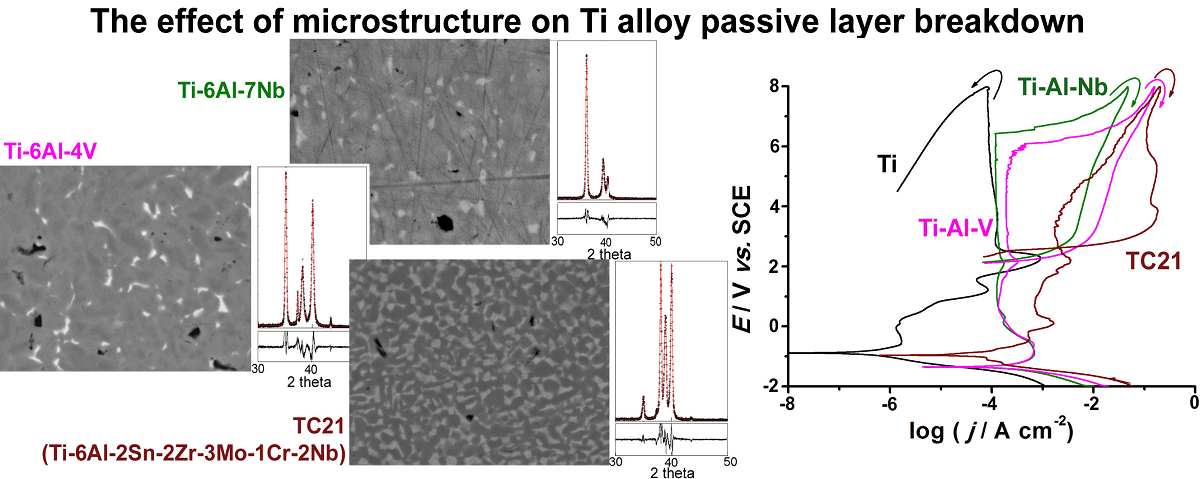 The effect of microstructure and chemistry of passive films on the kinetics of passive layer growth and passivity breakdown of some Ti-based alloys, namely Ti-6Al-4V, Ti-6Al-7Nb and TC21 alloys was studied. The rate of pitting corrosion was evaluated using cyclic polarization measurements. Chronoamperometry was applied to assess the passive layer growth kinetics and breakdown. Microstructure influence on the uniform corrosion rate of these alloys was also investigated employing Tafel extrapolation and dynamic electrochemical impedance spectroscopy. Corrosion studies were performed in 0.9% NaCl solution at 37 oC, and the obtained results were compared with ultrapure Ti (99.99%). The different phases of the microstructure were characterized by X-ray diffraction and scanning electron microscopy. Chemical composition and chemistry of the corroded surfaces were studied using X-ray photoelectron analysis. For all studied alloys, the microstructure consisted of α matrix, which was strengthened by β phase. The highest and the lowest values of the β phase’s volume fraction were recorded for TC21 and Ti-Al-Nb alloys, respectively. The uniform corrosion rate and pitting corrosion resistance (Rpit) of the studied alloys were enhanced following the sequence: Ti-6Al-7Nb < Ti-6Al-4V << TC21. The corrosion resistance of Ti-Al-Nb alloy approached that of pure Ti. The obvious changes in the microstructure of these alloys, together with XPS findings, were adopted to interpret the pronounced variation in their corrosion rates.