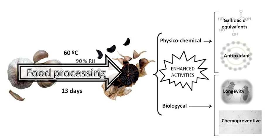 White and three types of black garlic (13, 32 and 45 days of fermentation, named 0C1, 1C2 and 2C1 respectively) were selected in order to check possible differences in their nutraceutic potential. For this purpose, garlic were physico-chemically characterised, and both in vivo and in vitro assays were carried out. Black garlic showed higher polyphenol content and antioxidant capacity than white garlic. The biological studies have shown that only white garlic was not safe showing toxicity effect. Furthermore, none garlic exert protective effects against H2O2, except the 0C1 black garlic. Moreover, garlic was non-genotoxic with the exception of the highest concentration of white garlic. On the other hand, 0C1 was the most antigenotoxic substance. The in vivo longevity assays yielded significant extension of lifespan results in some concentrations of white and 0C1and 1C2 black garlic. The in vitro experiments showed that all studied garlic induced a decrease in leukaemia cells growth. However, none type of garlic was able to induce proapoptotic internucleosomal DNA fragmentation. Taking into account the physicochemical and biological data, black garlic could be considered as a potential functional food and used in preventive treatment of age-related diseases. In addition, our findings could be relevant for the black garlic processing agrifood companies as the economical and timing costs are significantly reduced to 13 days aging.