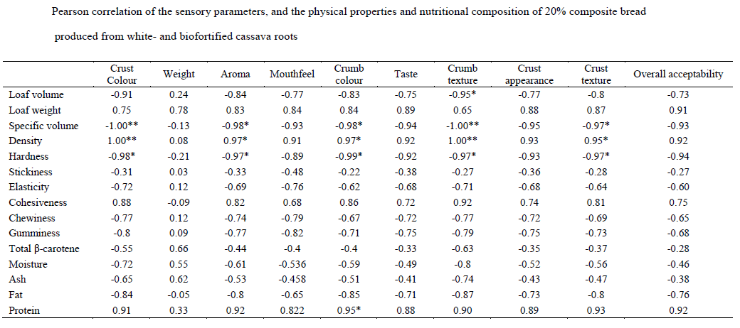 With proper processing and utilization, biofortified cassava may contribute to the nutritional status of the consumers, thus, the need for this study. High-quality cassava flour from white- (TME 419) and biofortified (TMS 01/1368) cassava varieties were produced at a commercial processing factory, after which the flour is composite with wheat flour to produce bread. The nutritional composition, physical properties and sensory quality of the composite bread were analyzed using standard methods. Results showed that composite bread from 20% biofortified cassava flour (20-YCF) had a higher value of total β-carotene (0.74 μg/g), moisture (37.83%) and ash (2.29%) contents. The fat (3.72%) and protein (12.83%) contents were higher in 20% white cassava flour (20-WCF) composite bread. The 20-YCF composite bread had the highest loaf volume (3286.2 cm3), elasticity (6.32), chewiness (40.51 N) and gumminess (6.41), 20-WCF composite bread had higher specific volume (3.59 cm3/g) and hardness (176.50 N). The 100% wheat bread had higher cohesiveness (0.10) and loaf weight (932.35 g). A significant negative correlation (r = - 0.98, p≤0.05) exist between bread hardness and protein content. The composite bread compared favourably with the 100% wheat bread in terms of weight and aroma, but, the 100% wheat bread was more acceptable.