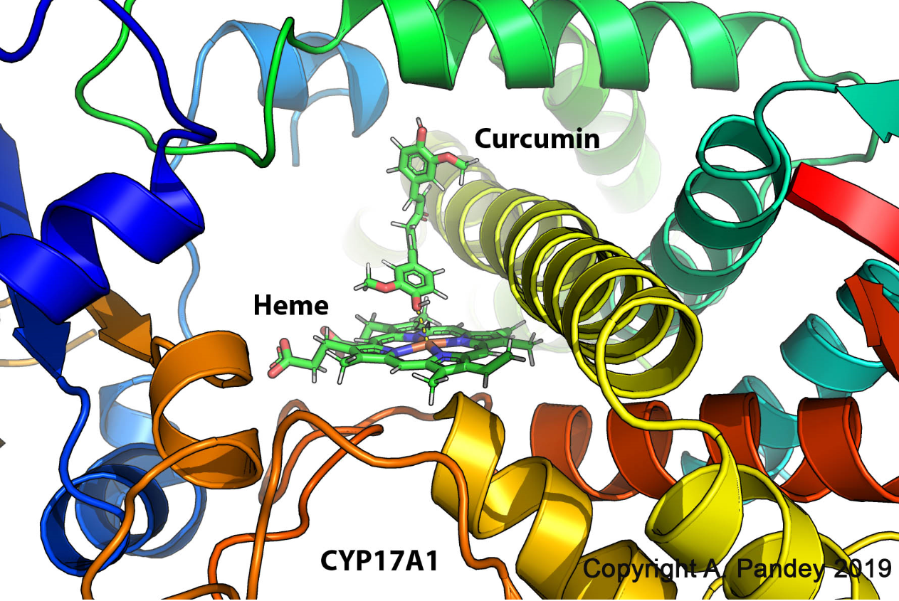 Turmeric is a popular ingredient in the cuisine of many Asian countries. Turmeric is known for its use in Chinese and Ayurvedic medicine and comes from the roots of the Curcuma longa. Turmeric is rich in curcuminoids, including curcumin, demethoxycurcumin, and bisdemethoxycurcumin. Curcumin has potent anti-inflammatory and anti-carcinogenic activities. Since many anti-cancer drugs target enzymes from the steroidogenic pathway, we tested the bioactivity of curcuminoids on cytochrome P450 CYP17A1, CYP21A2, and CYP19A1 enzyme activities. Curcuminoids were extracted from turmeric with organic solvents. We conducted a cell-based assay for CYP17A1 and CYP21A2 activities using human adrenal cell line NCI-H295R. 3H-pregnenolone was used for CYP17A1 assays, and 3H-17alpha-hydroxyprogesterone was used as a substrate for CYP21A2. Curcuminoids were added at different concentrations and incubated for 24h. Steroids were separated by thin layer chromatography and analyzed by phosphorimager analysis. For CYP19A1 activity, an in vitro assay using endoplasmic reticulum from JEG3 were used with 3H-androstenedione as the substrate. Curcuminoids were incubated for 1h, and the formation of 3H-water from the androstenedione breakdown was measured by scintillation counting. When using 10 µg/ml of curcuminoids, both the 17-hydroxylase as well as 17,20 lyase activities of CYP17A1 were reduced significantly. On the other hand, CYP21A2 activity was only reduced to ~50% control. Furthermore, CYP19A1 activity was reduced to ~20% of control when using 1-100 µg/ml of curcuminoids in a dose-dependent manner. No effect on the activity of 5alpha reductase for the conversion of androstenedione to androstanedione was observed. Molecular docking studies confirmed that curcumin could dock into the active sites of CYP17A1, CYP19A1 as well as CYP21A2. In CYP17A1 and CYP19A1, curcumin docked within 2.5 Å of central heme while in CYP21A2 the distance from heme was 3.4 Å, which is still in the same range or lower than distances of bound steroid substrates. These studies show that curcuminoids may potentially cause inhibition of steroid metabolism, especially at higher dosages. The activities of CYP17A1 and CYP19A1 were inhibited by curcuminoids, which indicate potential anti-carcinogenic effects in case of prostate cancer as well as breast cancer, which can be targeted by inhibition of steroidogenesis. Also, the recent popularity of turmeric powder/curcumin as a dilatory supplement needs further evaluation for the effect of curcuminoids on steroid metabolism. Curcuminoids present in curcumin may affect activities of multiple steroid metabolizing cytochrome P450 enzymes. Computational docking suggests curcumin binds into the active sites of steroid metabolizing P450s and may serve as a model for lead discovery. Molecular structure of curcuminoids could be modified to generate better lead compounds with inhibitory effects on CYP17A1 and CYP19A1 for potential drugs against prostate cancer and breast cancer.