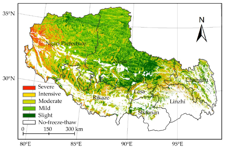 Traditionally, studies on freeze–thaw erosion have used the analytic hierarchy process (AHP) to calculate the weight of evaluation factors, however, this method cannot accurately depict the fuzziness and randomness of the problem. To overcome this disadvantage, the present study has proposed an improved AHP method based on the cloud model to evaluate the impact factors in freeze–thaw erosion. To establish an improved evaluation method for freeze–thaw erosion in Tibet, the following six factors were selected: annual temperature range, average annual precipitation, slope, aspect, vegetation coverage, and topographic relief. The traditional AHP and the cloud model were combined to determine the weight of the impact factors, and a consistency check was performed. The comprehensive evaluation index model was used to evaluate the intensity of freeze–thaw erosion in Tibet. The results show that freeze–thaw erosion is extensive, stretching over approximately 66.1% of Tibet. The problem is the most serious in Ngari Prefecture and Nagqu. However, mild erosion and moderate erosion, accounting for 37.1% and 25.0%, respectively, of the total freeze–thaw erosion are the most widely distributed. The evaluation results for the freeze–thaw erosion was confirmed to be consistent with the actual situation. In brief, this study provided a new approach to evaluate the conditions of freeze–thaw erosion quantitively in Tibet.