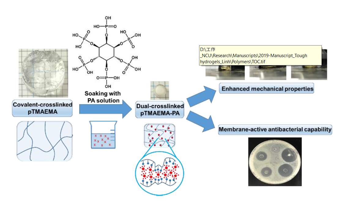 Tough and antimicrobial dual-crosslinked poly((trimethylamino)ethyl methacrylate chloride)-phytic acid hydrogel (pTMAEMA-PA) has been synthesized by adding chemical crosslinker and docking physical crosslinker of multivalent phytic acid into a cationic polyelectrolyte network. By increasing the loading concentration of PA, the tough hydrogel exhibits compressive stress of >1 MPa, along with high elasticity and fatigue-resistant properties. The enhanced mechanical properties of pTMAEMA-PA were stem from multivalent ion effect of PA via the formation of ion bridges within polyelectrolytes. In addition, a comparative study for a series of pTMAEMA-counterion complexes was conducted to elaborate the relationship between swelling ratio and mechanical strength. The study also revealed secondary factors, such as ion valency, ion specificity and hydrogen bond formation, holding crucial roles in tuning mechanical properties of the polyelectrolyte hydrogel. Furthermore, in bacteria attachment and disk diffusion tests, pTMAEMA-PA exhibits superior fouling resistance and antibacterial capability. The results reflect the fact that PA enables chelating strongly with divalent metal ions, hence, disrupting the outer membrane of bacteria, as well as dysfunction of organelles, DNA and protein. Overall, the work demonstrated a novel strategy for preparation of tough polyelectrolyte with antibacterial capability via docking PA to open up the potential use of PA in medical application.