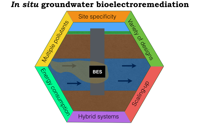 Groundwater contamination is an ever-growing environmental issue that has attracted much and undiminished attention for the past half century. Groundwater contamination may originate from both anthropogenic (e.g., hydrocarbons) and natural compounds (e.g., nitrate and arsenic); to tackle the removal of these contaminants, different technologies have been developed and implemented. Recently, bioelectrochemical systems (BES) have emerged as a potential treatment for groundwater contamination, with reported in situ applications that showed promising results. Nitrate and hydrocarbons (toluene, phenanthrene, benzene, BTEX and light PAHs) have been successfully removed, due to the interaction of microbial metabolism with poised electrodes, in addition to physical migration due to the electric field generated in a BES. The selection of proper BESs relies on several factors and problems, such as the complexity of groundwater and subsoil environment, scale-up issues, and energy requirements that need to be accounted for. Modeling efforts could help predict case scenarios and select a proper design and approach, while BES-based biosensing could help monitoring remediation processes. In this review, we critically analyze in situ BES applications for groundwater remediation, focusing in particular on different proposed setups, and we identify and discuss the existing research gaps in the field.