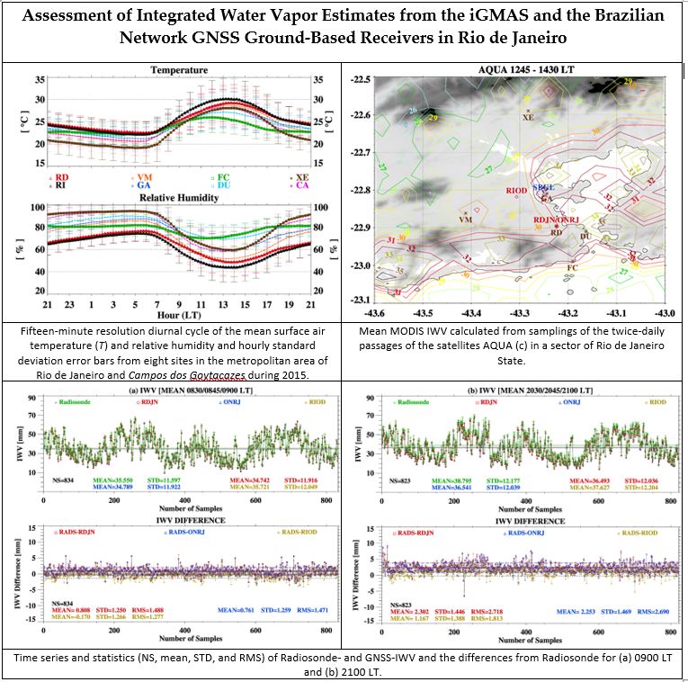 There is crescent demand for knowledge improvement of the integrated water vapor (IWV) distribution in regions affected by heat islands that are associated with extreme rainfall events such as in the metropolitan area of Rio de Janeiro (MARJ). This work assessed the suitability and distribution of IWV in the MARJ using products from the Global Navigation Satellite Systems (GNSS), MODerate Resolution Imaging Spectroradiometer (MODIS), and radiosonde. GNSS data were collected by the tracking station named RDJN, from the cooperation of the International GNSS Monitoring and Assessment System (iGMAS) and the National Observatory of Brazil (Observatório Nacional - ON), and the tracking stations ONRJ, RIOD, and RJCG belonging to the Brazilian Network for Continuous Monitoring (RBMC) in the period of January 2015–August 2018. High variability of the near surface air temperature (T) and relative humidity (RH) were observed among eight meteorological sites considered. The mean T differences between sites, up to 4.4 °C, led to mean differences as high as 3.1 K for weighted mean temperature (Tm) and hence 0.83 mm for IWV differences. The performance of the MODIS MOD07 and MYD07 products provided a reasonably good representation of the mean spatial distribution of IWV, especially during the daylight passages of the satellites TERRA and AQUA. Local grid points of MODIS IWV estimates had relatively good agreement with the GNSS-derived IWV, with mean differences from -2.4–1.1 mm considering only daytime passages of the satellites TERRA and AQUA. During nighttime, MODIS underestimated IWV (from -9–-3 mm) with respect to GNSS, due to attenuation of IR radiation by clouds. A contrasting behavior was found in the radiosonde IWV estimates compared with the estimates from GNSS. There were dry biases of 1.4 mm (3.7% lower than expected) by radiosonde IWV during the daytime considering that all other estimates were unbiased and the differences between IWV GNSS and IWV RADS were consistent. Based on the IWV comparisons between radiosonde and GNSS at nighttime, the atmosphere over the radiosonde site is about 1.2 (2.3) mm wetter than over RIOD (RDJN) station. The long time series of the comparisons between IWVRDJN and IWVRIOD showed that the highest values of IWV occurred from the afternoon to nocturnal hours. Further, the atmosphere over the site RIOD was consistently about 1 mm wetter than over RDJN. These results showed the feasibility of the iGMAS RDJN station data compared with the RBMC, MODIS, and radiosonde data to investigate IWV in a region with occurrence of heat islands, and the peculiar physiographic and meteorological characteristics as in the MARJ. This work recommended the usage of complete meteorological station data collocated near every GNSS receiver aiming improvements of local GNSS IWV estimates and serving as additional support for operational numerical assimilation, weather forecast, and nowcast of extreme rainfall events.