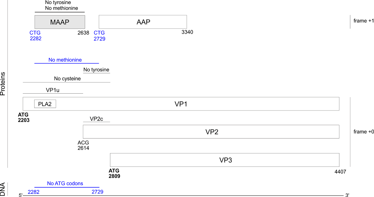 Adeno-associated viruses (AAVs, genus dependoparvovirus) are promising gene therapy vectors. In strains AAV1-12, the capsid gene VP1 encodes a recently discovered protein, MAAP, in an overlapping frame. MAAP binds the cell membrane by an unknown mechanism. We discovered that MAAP is also encoded in bovine AAV and in porcine AAVs (which have shown promise for gene transfer into muscle tissues), in which it is probably translated from a non-canonical start codon. MAAP is predicted to be mostly disordered except for a predicted C-terminal, membrane-binding amphipathic α-helix. MAAP has a highly unusual composition. In particular, it lacks internal methionines, and is devoid of tyrosines in most strains. Unexpectedly, we discovered that the N-terminus of VP1 also lacks several amino acids. In all AAVs that encode MAAP, the first 200 aas of VP1 are devoid of internal methionines, probably owing to a selection against ATG codons that could prevent translation of MAAP and of capsid isoforms (VP2, VP3). The N-terminus of VP1 also lacks cysteines, likely to avoid the formation of disulfide bridges when it becomes exposed outside of the capsid during post-endocytic trafficking. Finally, the region common to VP1 and VP2 lacks tyrosine in the vast majority of AAVs that encode MAAP. Avoiding these "forbidden" aas in MAAP and VP1 when creating recombinant AAV capsids might increase the efficiency of capsid design. Conversely, the presence of "forbidden" aas in some rare strains probably indicates that they have unusual properties that could help us understand the viral cycle.