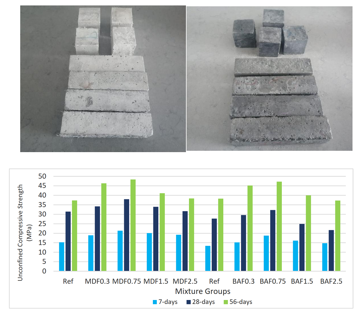 The damage caused by global warming is rapidly increasing, and its adverse effects become more evident with each passing day. Although it is known that the use of alternative binder materials in concrete would decrease this negative effect, reluctance to new composites continues. Waste use plays a vital role in sustainability studies. In this study, pure cement paste was prepared and enriched with carbon fiber. This study investigated the wide range of volume fraction of carbon fiber in cement-based composites. Two different industrial wastes, marble dust, and bottom ash were chosen and mixed with cement and four different (0.3%, 0.75%, 1.5%, and 2.5%) carbon fiber volume fractions. Based on physical, mechanical, and durability tests at 7, 28, and 56-days of curing, the composites were resistant to sulfate and seawater attack. The 0.75% carbon fiber addition seems to be an optimum volume percentage beyond which both physical and mechanical properties were adversely affected. The composites with 0.75% carbon fiber have reached 48.4 MPa and 47.2 MPa at 56-days of curing for marble dust and bottom ash mixture groups, respectively.