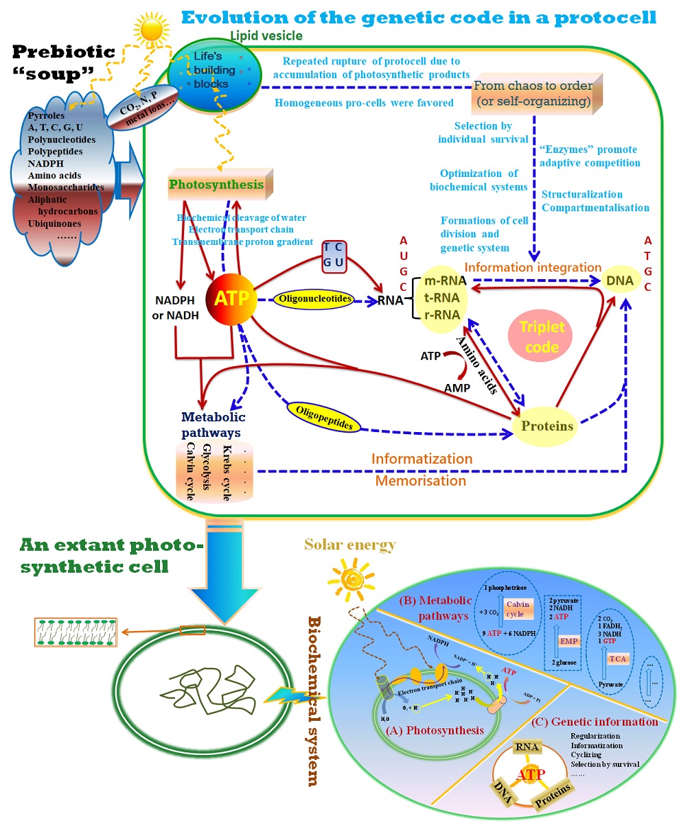 A plenty of theories on the origin of genetic codes have been proposed so far, yet all ignored its energetic relation to the biochemical system. Here, a new hypothesis is proposed, according to which ATP is at the origin of the primordial genetic code by its coevolution with the pristine biochemical system. This hypothesis aims to show how the genetic code was produced by photochemical reactions in a protocell that derived from a lipid vescile enclosing various life’s building blocks (e.g. nucleotides and peptides). At extant cell, ATP is the only energetic product of photosynthesis, and is at the energetic heart of the biochemical systems. ATP could energetically elongate chains of both polynucleotides and polypeptides, thus providing a bridge between these bio-polymers and eventually mediating cellular biochemical innovation from energy transformation to informatization. ATP was not the only one that could drive the formation of polynucleotides and polypeptides, but favored by precellular selection. The protocell innovated a photosynthesis system to produce ATP efficiently and regularly with the aids of proteins and RNA/DNA. The completion of the genetic code from RNA to DNA marked the dawn of cellular life operated by Darwinian evolution. The ATP hypothesis supports the photochemical origin of life, shedding light on the formation of both photosynthetic and biochemical systems, which remains largely unknown thus far.