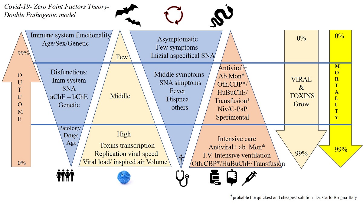 Acetylcholine (ACh) is the best one characterized neurotransmitter. Its central roles in the cholinergic areas and central nervous system (CNS) and peripheral (PNS) synapses are well known. It was the first molecule identified as a neurotransmitter and appears to be phylogenetically the oldest one signaling molecules. ACh was detected in bacteria, protozoa, fungi, algae and primitive plants, indicating that the cholinergic system was widely distributed in living organisms before its appearance in the nervous system. The autonomous nervous system (ANS) is an integral part animal kingdom history. It determines fight-escape reactions as well as outlining the vital and cognitive functions bio-organization rhythms. The virus (Covid-19) extraneous effects acting on it could help to better understand its functions. The Blast results show some factors like protein that can be implicated such as bungaro-toxins, phospholipase A2 and the similar prothrombin activator protein. A positive correlation with different toxins is obtained and the Covid-19 double pathogenic mechanism theory is proposed. The process allows us to outline the possibility about toxic-like factors presence.
