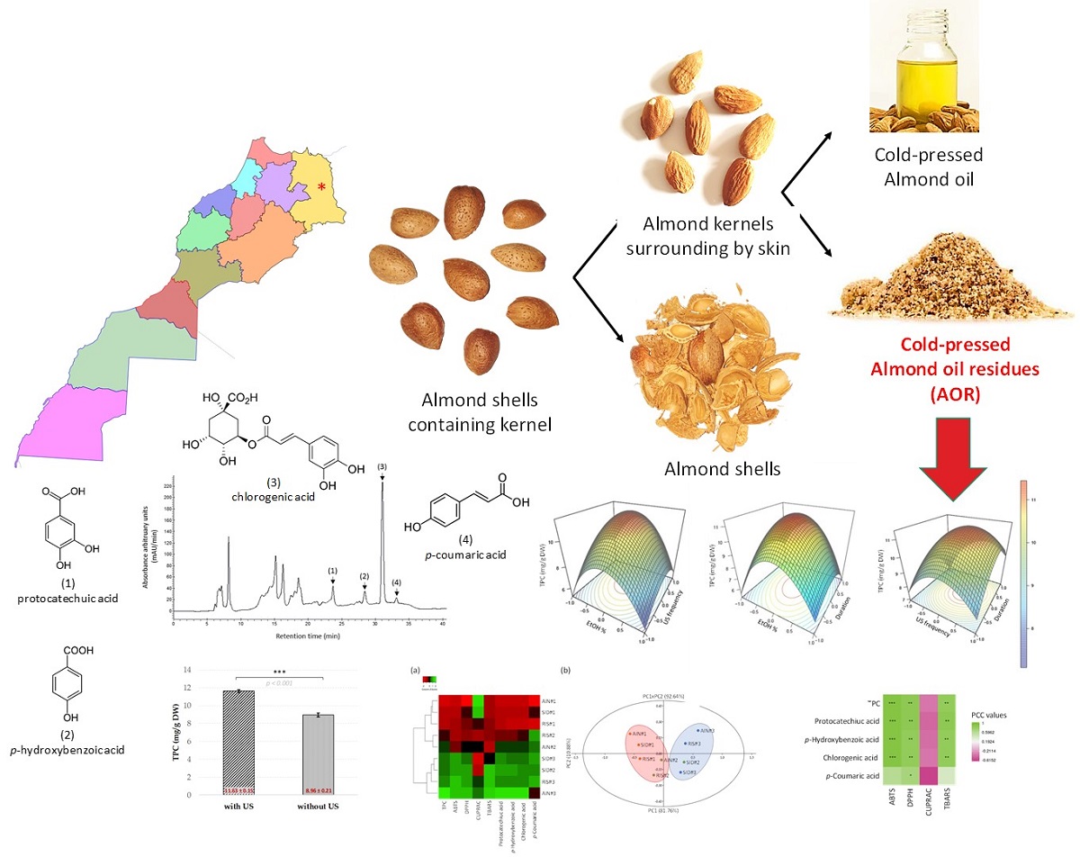 Almond (Prunus dulcis (Mill.) D.A.Webb) is one of the most important nut crops both in terms of area and production. Over the last decades, an important part of the beneficial actions for health associated with their consumption was attributed to the phenolic compounds, mainly accumulated in almond skin. Interestingly, after cold-pressed oil extraction, most of these antioxidant phenolic compounds are retained in a skin-enriched by-product, so-called almond cold-pressed oil residue. In Morocco, ranked fifth producer in the world, this production generates an important part of this valuable byproduct. In the present study, using a multivariate Box-Behnken design, an ultrasound-assisted extraction (USAE) method of phenolic compounds from Moroccan almond cold-pressed oil residue was developed and validated. Response surface methodology resulted in the optimal extraction conditions: the use of aqueous EtOH 53.0% (v/v) as green solvent, applying an US frequency of 27.0 kHz for an extraction duration of 29.4 min. The present USAE allowed substantial gains in terms of extraction efficiency compared to conventional heat reflux extraction. Applied to 3 different local Beldi genotypes growing at 3 different experimental sites, the optimal USAE conditions led to a total phenolic content of 13.86 mg/g dry weight (DW). HPLC analysis revealed that the main phenolic compounds from this valuable byproduct were: chlorogenic acid followed by protocatechuic acid, p-hydrobenzoic acid and p-coumaric acid. The accumulation of these phenolic compounds appeared to be more dependent on the genetic background than on the environmental impact here represented by the 3 experimental culture sites. Both in vitro cell free and cellular antioxidant assays were performed, and revealed the great potential of these extracts. In particular, correlation analysis evidenced the prominent roles of chlorogenic acid, protocatechuic acid and p-hydrobenzoic acid. To summarize, the USAE method presented here is a quick, green, simple and efficient validated USAE for the possible valorization of antioxidant phenolic compounds from Moroccan almond cold-Pressed oil residues, making it possible to generate extracts with attractive antioxidant activities for future nutraceutical and/or cosmetic applications.