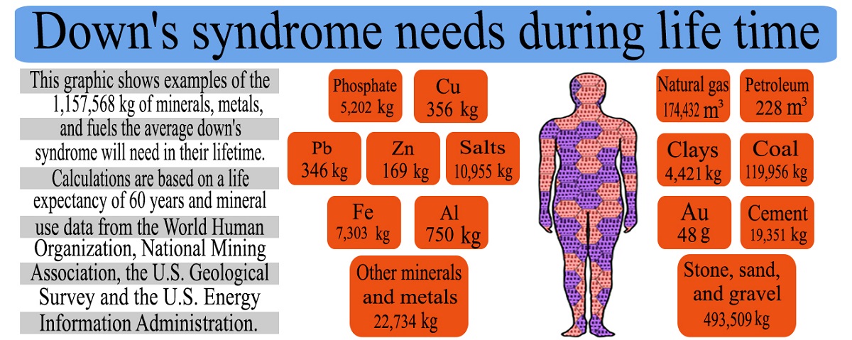 To reduce the risk factors for mortality, the paper has focused on the assessment of the socioeconomic, clinical, physical, biophysiological, and biochemical characteristics of Down's syndrome which can be affected by the type of nutrition system, toxicity, and ecological footprint. Patients were males with trisomy 21 diagnosed by karyotype test and assessed by clinical examinations. Samples were collected from different biofluids. The physicochemical analyses of the biomatrix samples were performed and these properties had compared to findings of healthy males and age-matched controls. Duraphat application was proved effective for their oral treatment and saliva was the optimum biomarker for detecting malnutrition. Patients were hypersensitive to Cu while the Mn content in blood and hair was considered an expression to the degree of epileptic condition and chronic seizure development. The ecological footprint was 5.6 gha and carbon footprint was recognised in food poverty habits. These can be reduced by eating more plant-based proteins and fibre-rich foods with low saturated fats and sodium. The findings provide an up-to-date reference for expected developmental outcomes in children with DS in terms of biophysicochemistry. The genetically sensitive intervention is affected by heredity factor and sensitivity to toxics. Down's syndrome is encouraged to live green-hipster life.