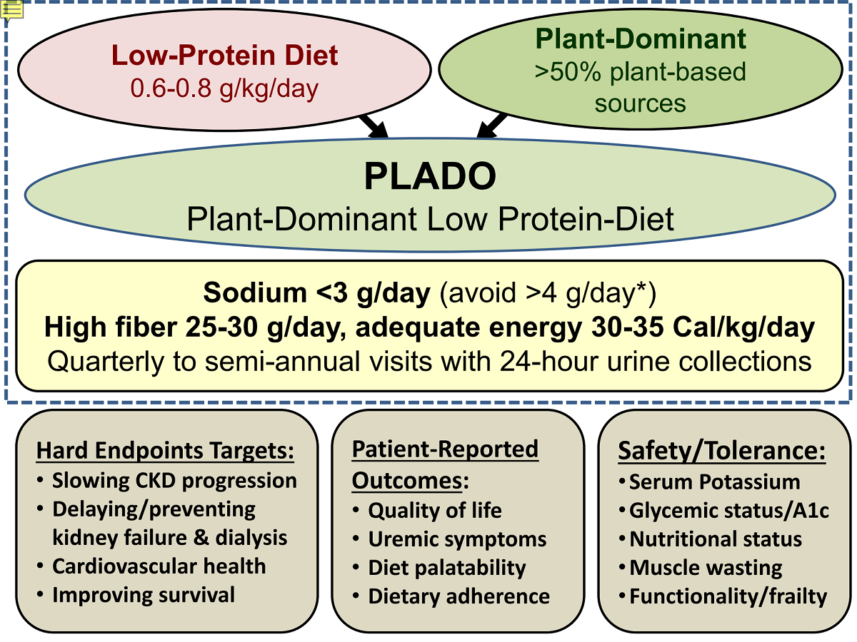Chronic kidney disease (CKD) affects >10% of the adult population. Each year approximately 120,000 Americans develop end-stage kideny disease and initiate dialysis, which is costly and associated with functional impairments, worse health-related quality of life, and high early-mortality rates exceeding 20% in the first year. Recent declarations by the World Kidney Day and the U.S. Government Executive Order seek to implement strategies that reduce the burden of kidney failure by slowing CKD progression and controlling uremia without dialysis. Pragmatic dietary interventions may have a role in improving CKD outcomes and preventing or delaying dialysis initiation. Evidence suggests that a patient-centered plant-dominant low-protein diet (PLADO) of 0.6-0.8 g/kg/day comprised of >50% plant-based sources, administered by dietitians trained in non-dialysis CKD care, can be promising. The scientific premise of the PLADO is based on the observations that high protein diets with high meat intake are not only associated with higher cardiovascular disease risk but also higher CKD incidence and faster CKD progression due to increased intraglomerular pressure and glomerular hyperfiltration. Meat intake increases production of nitrogenous end-products, worsens uremia, and may increase the risk of hyperkalemia, given constipation from the typical low fiber intake. Plant-dominant, fiber-rich, low-protein diet may lead to favorable alterations in the gut microbiome, which can modulate uremic toxin generation and slow CKD progression, along with reducing cardiovascular risk in CKD patients. PLADO is a heart-healthy, safe, flexible, and feasible diet that could be the centerpiece of a conservative and preservative CKD-management strategy that challenges the prevailing dialysis-centered paradigm.