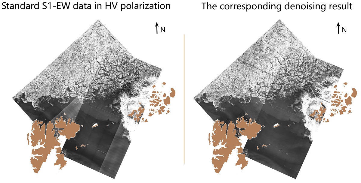 Sentinel-1 (S1) extra-wide (EW) swath data in cross-polarization (horizontal-vertical, HV or vertical-horizontal, VH) are strongly affected by the scalloping effect and thermal noise, particularly over areas with weak backscattered signals, such as sea surfaces. Although noise vectors in both the azimuth and range directions are provided in the standard S1 EW data for subtraction, the residual thermal noise still significantly affects sea ice detection by the EW data. In this paper, we improve the denoising method developed in previous studies to remove the additive noise for the S1 EW data in cross-polarization. Furthermore, we propose a new method for eliminating the residual noise (i.e. multiplicative noise) at the sub-swath boundaries of the EW data, which cannot be well processed by simply subtracting the reconstructed 2-D noise field. The proposed method of removing both the additive and multiplicative noise was applied to EW HV-polarized images processed using different Instrument Processing Facility (IPF) versions. The results suggest that the proposed algorithm significantly improves the quality of EW HV-polarized images under various sea ice conditions and sea states in marginal ice zone (MIZ) of the Arctic. This is of great support for the utilization of cross-polarization SAR images in wide swaths for intensive sea ice monitoring in polar regions.