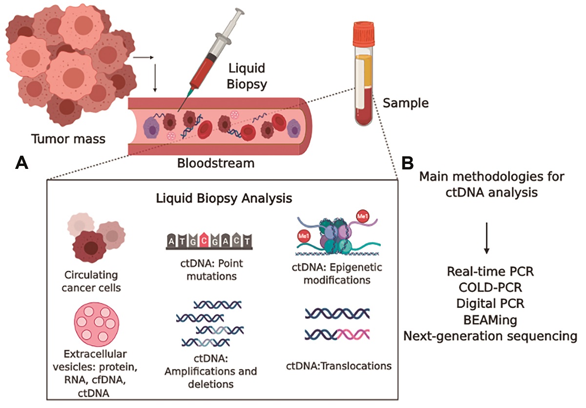 Circulating tumor DNA (ctDNA) in fluids has gained attention because ctDNA seems to identify tumor-specific abnormalities, which could be used for diagnosis, follow-up of treatment, and prognosis: the so-called liquid biopsy. Liquid biopsy is a minimally invasive approach and presents the sum of ctDNA from primary and secondary tumor sites. It has been possible not only to quantify the amount of ctDNA but also to identify (epi)genetic changes. Specific mutations in genes have been identified in the plasma of patients with several types of cancer, which highlights ctDNA as a possible cancer biomarker. However, achieving detectable concentrations of ctDNA in body fluids is not an easy task. ctDNA fragments present a short half-life, and there are no cut-off values to discriminate high and low ctDNA concentrations. Here, we discuss the use of ctDNA as a cancer biomarker, the main methodologies, the inherent difficulties, and the clinical predictive value of ctDNA.