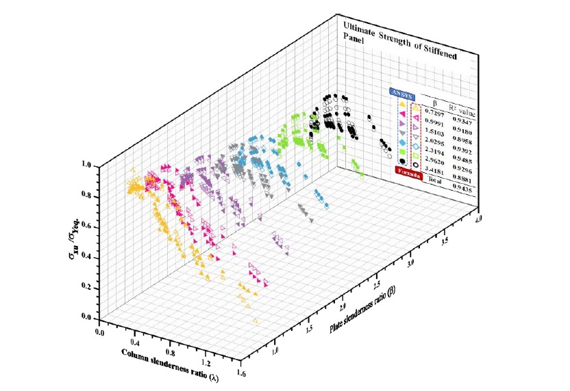 This research aims to study the ultimate limit state (ULS) behaviour of stiffened panel under longitudinal compression by non-linear finite element method (NLFEM). There are different types of stiffeners being used in shipbuilding i.e. T-bar, flat-bar and angle-bar. However, this research focuses on the ultimate compressive strength behaviour of flat-bar stiffened panel. A total of 420 of reliable scenarios of flat-bar stiffened panel are selected for numerical simulation by ANSYS NLFEM. The ultimate strength behaviours obtained were used as data for the development of closed form shape empirical formulation. Recently, Kim et al. [1] proposed for advanced empirical formulation for T-bar stiffened panel and the applicability of the proposed formulation to flat-bar stiffened panel will be confirmed by this study. The accuracy of the empirical formulation obtained for flat-bar stiffened panel has been validated by FE simulation results of statistical analysis (R2 = 0.9435). The outcome obtained will be useful for ship structural designers in predicting the ultimate strength performance of flat-bar type stiffened panel under longitudinal compression.
