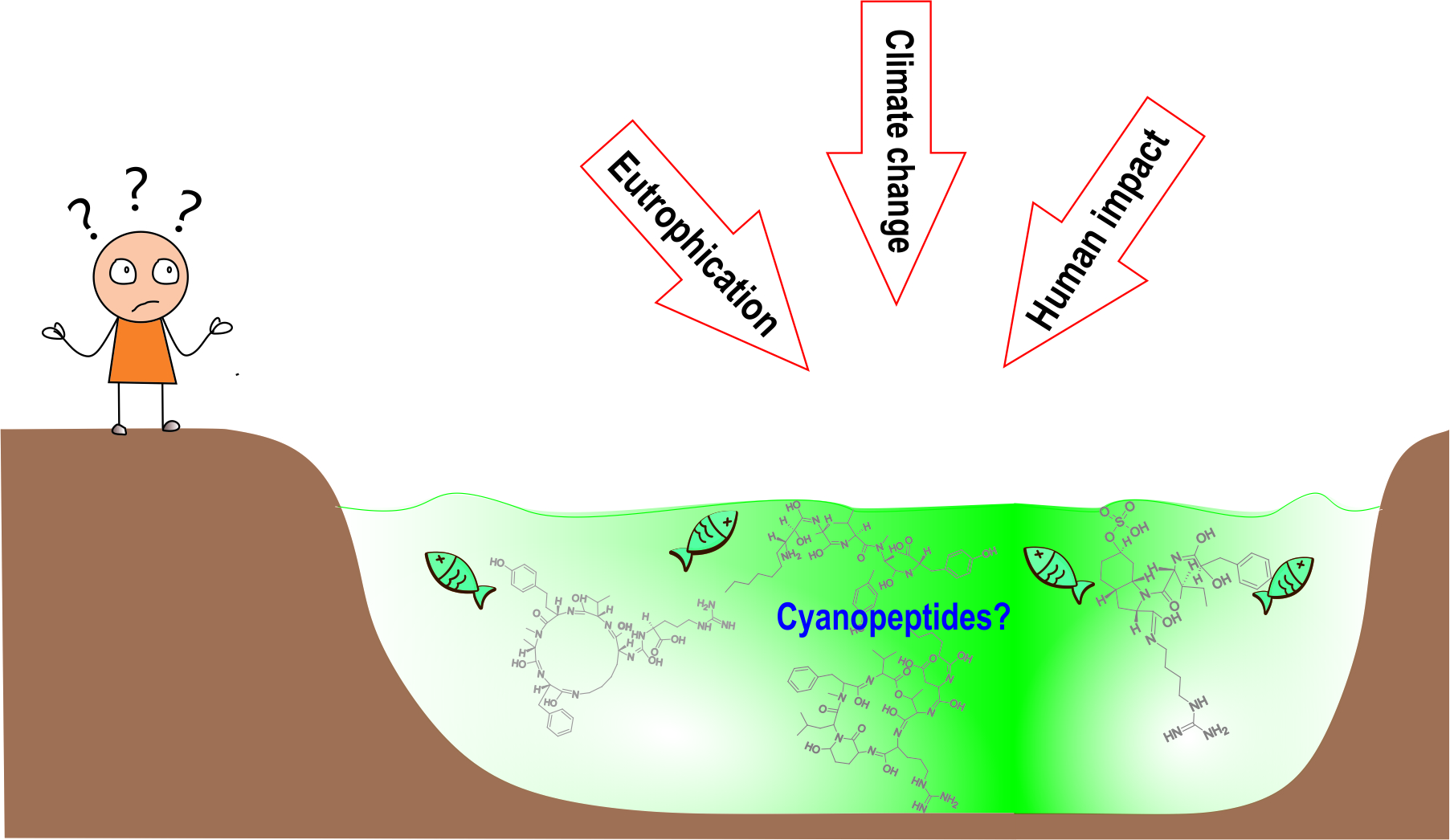 Man-made shallow fishponds in the Czech Republic have been facing a high eutrophication since 1950s. Anthropogenic eutrophication and feeding of fish have strongly affected the physico-chemical properties of water and its aquatic community composition leading to harmful algal bloom formation. In our current study, we have characterised the phytoplankton community across three hypertrophic ponds to assess the phytoplankton dynamics during the vegetation season. We microscopically identified and quantified 29 cyanobacterial taxa comprised of non-toxigenic and toxigenic species. Further, a detailed cyanopeptides (CNPs) profiling was performed using molecular networking analysis of liquid chromatography tandem mass spectrometry (LC–MS/MS) data coupled with dereplication strategy. This MS networking approach coupled with dereplication on online global natural product social networking (GNPS) web platform led us to putatively identify forty CNPs: fourteen anabaenopeptins, ten microcystins, five cyanopeptolins, six microginins, two cyanobactins, a dipeptide radiosumin, a cyclooctapeptide planktocyclin and epidolastatin12. We have applied the binary logistic regression to estimate the CNPs producer by correlating the GNPS data with the species abundance. Usage of The combination of molecular networking and dereplication on online global natural product social networking (GNPS) web platform has proved as a valuable approach for rapid and simultaneous detection of high number of peptides, and rapidly assessing the risk for harmful bloom.