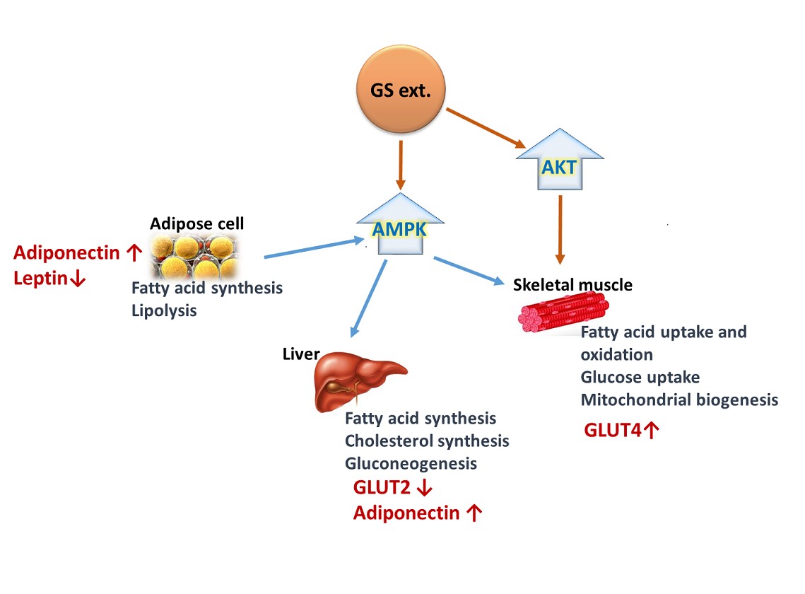 Anti-diabetic effects of Glycine soja seed extract (GS) on Type 2 diabetes mellitus mouse model and human hepatocytes induced insulin resistance were investigated. 3 weeks old db/db mice were divided into 5 groups (n = 6) including two control groups and 3 GS treated groups with different doses. Oral administration of GS for 6 weeks to diabetic db/db mice reduced blood glucose level significantly in a dose dependent manner by 44.7% (300 mg/kg/day), 30.9% (150 mg/kg/day) and 21.1% (75 mg/kg/day). GS treatment also lowered significantly plasma level of HbA1c, insulin, IGF-1 and leptin, and increased that of adiponectin. GS treatment activated AMPK, and down-regulated GLUT2 in liver tissues of mice while up-regulated GLUT4 in muscle tissues of mice. In in vitro study with insulin resistance induced human hepatocyte, GS treatment increased glucose uptake and increased the activities of Akt and PPAR-γ in response to insulin. Treatment of GS appears to reduce blood glucose level by regulating energy metabolism positively through various metabolic pathways and reducing insulin resistance in Type 2 diabetes mellitus.