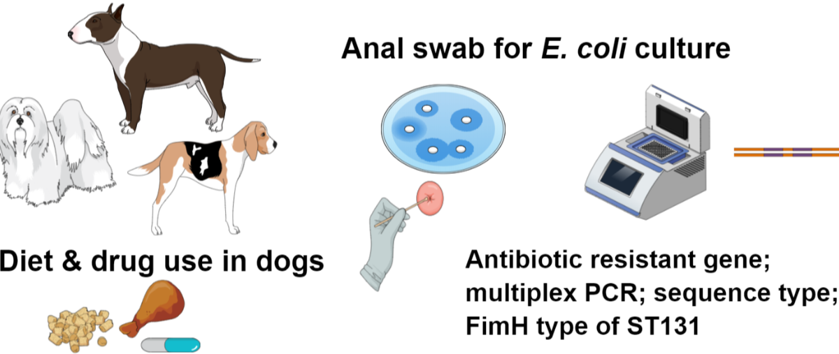 Background: Most drug-resistant Escherichia coli isolates in dogs come from diseased dogs. Prior to this study, the prevalence and risk factors of fecal carriage drug-resistant E. coli and epidemic clone sequence type (ST) 131 (including subtypes) isolates in dogs were unknown. Methods: Rectal swabs were used for E. coli isolation from 299 dogs in a veterinary teaching hospital in Taiwan. Antibiotic resistance and multiplex PCR analyses of E. coli for major STs were performed. Result: There were 43.1% cefazolin-resistant, 22.1% fluoroquinolone-resistant, and 9.4% extended-spectrum beta-lactamase-producing E. coli in our cohort. In the phylogenetic study, B2 was the predominant group (30.1%). The cefazolin-resistant group and ciprofloxacin-resistant group had greater antibiotic exposure in the last 14 days (P < 0.05). The age, sex, and dietary habits of the antibiotic-resistant and -susceptible groups were similar. In the seven isolates of ST131 in fecal colonization, the most predominant subtypes were FimH41 and FimH22. Conclusion: Recent antibiotic exposure was related to the fecal carriage of antibiotic-resistant E. coli isolates. Three major subtypes (FimH41, H22, and H30) of ST131 can thus be found in fecal carriage in dogs in Taiwan.