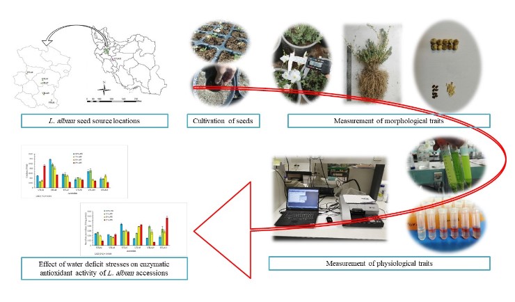 Linum album is an important medicinal plant contains important lignan compounds such as podophyllotoxin as well as fatty acids. Despite the high medicinal value, it has not been studied in agricultural conditions so far. This study was conducted to evaluate the morphological, phenological, and physiological responses of six L. album accessions under water deficit treatments (100% available water, 75%, 50%, and 25%) in pot conditions. Based on the results the morphological properties of accessions reduced due to water deficit. Accessions of UTLA7 and UTLA9 showed higher seed yield and dry weight of the vegetative part. The occurrence of phenological stages in the accessions showed a significant difference. Maturity was accelerated in plants under stress conditions, and accession of UTLA9 completed its growth earlier than others. Physiological responses of the accessions did not have the same trend based on the measured traits, and significant differences were observed depending on the trait and accession. The most important result of this study was the diversity of responses in different accessions. The results showed that the effect of water stress on the measured traits depends on the level of stress and accession, which suggests that it is possible to select the tolerable accessions for the production of the desired product. Based on the results, plant breeders may be able to use the chlorophyll content as a marker to identify tolerate L. album accessions.