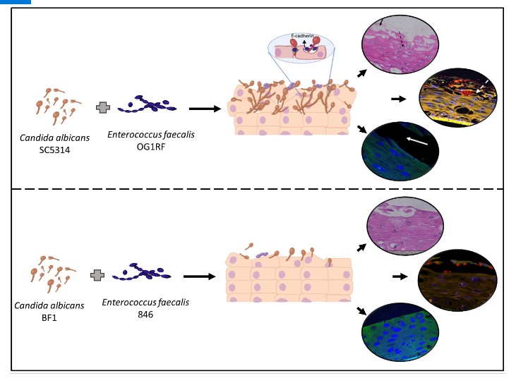 Candida albicans as an opportunistic pathogen exploits the host immune system and causes a variety of life-threatening infections. The polymorphic nature of this fungus gives it tremendous advantage to breach mucosal barriers and cause a variety of oral and disseminated infections. Enterococcus faecalis, another opportunistic pathogen co-exists with C. albicans in several niches in the human body, including the oral cavity and gastrointestinal tract. However, interactions between E. faecalis and C. albicans on oral mucosal surfaces remain unknown. Here, for the first time, we comprehensively characterized the interactive profiles between laboratory and clinical isolates of C. albicans (SC5314 and BF1) and E. faecalis (OG1RF and 846) on an organotypic oral mucosal model. Our results demonstrated that the two species formed robust biofilms on the mucosal tissue surface with profound surface erosion and fungal invasion. Specifically, this effect was more pronounced in the laboratory isolates than in the clinical isolates. Notably, several genes of C. albicans involved in tissue adhesion, hyphal formation, fungal invasion, and biofilm formation were significantly upregulated in the presence of E. faecalis. This study highlights the strain-dependent cross-kingdom interactions between E. faecalis and C. albicans on oral mucosa, demonstrating the requisite to study more substrate-dependent polymicrobial interactions.
