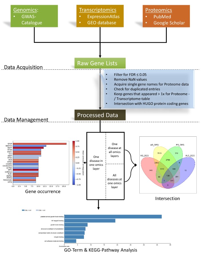 Neurodegenerative diseases such as Alzheimer's disease, Parkinson's disease, Huntington's disease, and Amyotrophic Lateral Sclerosis are heterogeneous, progressive diseases with frequently overlapping symptoms characterized by a loss of neurons. Studies suggested relations between neurodegenerative diseases for many years, e.g., regarding the aggregation of toxic proteins or triggering endogenous cell death pathways. Within this study, publicly available genomic, transcriptomic and proteomic data were gathered from 188 studies and more than one million patients to detect shared genetic patterns between the neurodegenerative diseases and the analyzed omics-layers within conditions. The results show a remarkably high number of shared genes between the transcriptomic and proteomic levels for all diseases while showing a significant relation between genomic and proteomic data only in some cases. A set of 139 genes was found to be differentially expressed in several transcriptomic experiments of all four diseases. These 139 genes showed overrepresented GO-Terms and pathways mainly involved in stress response, cell development, cell adhesion, and the cytoskeleton. Furthermore, the overlap of two and three omics-layers per disease were used to search for overrepresented pathways and GO-Terms. Taken together, we could confirm the existence of many relations between Alzheimer's disease, Parkinson's disease, Huntington's disease, and Amyotrophic Lateral Sclerosis on the transcriptomic and proteomic level by analyzing the pathways and GO-Terms arising in these intersections. The significance of the connection between the transcriptomic and proteomic data for all four analyzed neurodegenerative diseases showed that exploring these omics-layers simultaneously holds new insights that do not emerge from analyzing these omics-layers separately. Our data therefore suggests addressing human patients with neurodegenerative diseases as complex biological systems by integrating multiple underlying data sources.