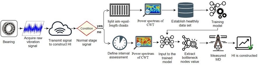 Estimating the remaining useful life (RUL) of components is a crucial task to enhance the reliability, safety, productivity, and to reduce maintenance cost. In general, predicting the RUL of a component includes constructing a health indicator ( ) to infer the current condition of the component, and modelling the degradation process, to estimate the future behavior. Although many signal processing and data-driven based methods were proposed to construct the , most of the existing methods are based on manual feature extraction techniques, and need the prior knowledge of experts, or rely on a large amount of failure data. Therefore, in this study, a new data-driven method based on the convolutional autoencoder (CAE) is presented to construct the . For this purpose, the continuous wavelet transform (CWT) technique is used to convert the raw acquired vibrational signals into a two-dimensional image; then, the CAE model is trained by the healthy operation dataset. Finally, the Mahalanobis Distance (MD) between the healthy and failure stages is measured as the . The proposed method is tested on a benchmark bearing dataset and compared with several other traditional construction models. Experimental results indicate that the constructed exhibits a monotonically increasing degradation trend and has a good performance to detect incipient faults.