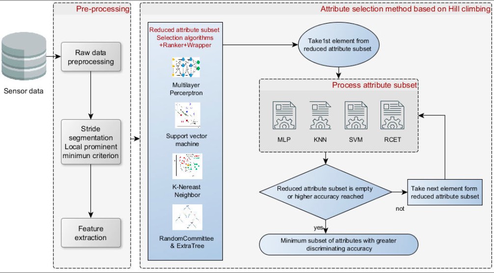 The progressive impairment analysis in gait from neurological diseases patients such as Hereditary Ataxias (HA) has been carried out using gait data collected with movement sensors. This research is focused on finding the minimum amount required of gait features to recognize efficiently and less intrusive way, HA patients based on data collected with iPhone movement sensors placed on the ankles from 14 HA patients and 14 healthy people. A twofold proposal is made , first a local minimum prominent peak criterion to find out the starting point of each stride, to get 10-stride window about which 56 spatial-temporal features are derived; second a search strategy based on Hill Climbing algorithm to reduce the number of gait features and sensors. The main results were the findings that with two gait patterns a 96% of classification accuracy was achieved by using K-Nearest Neighbors (KNN) and Multi-Layer Perceptron (MLP) algorithms, but in addition, MLP only right ankle sensor patterns were required which also allows to reduce the intrusion.