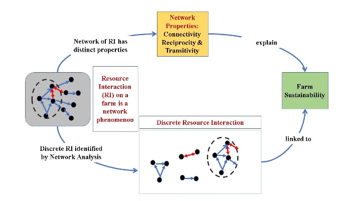 Shrinking farm size and fragile farm resources pose a significant challenge to the sustainability of small-scale farms. Efficient resource utilization in small-scale farms is crucial to achieving farm sustainability through endogenous mechanisms. However, the precise mechanisms to integrate physical resources to achieve farm sustainability are not very clear yet. By capturing the interaction among farm resources as a network phenomenon, we identify the discrete resource interactions (RIs) in different types of small-scale farms of Indian Sundarbans, which are associated with higher farm sustainability. Thirty-two linkages, 11 reciprocal linkages, 22 triads, and three ‘core elements’ that occurred and cooccurred on highly sustainable farms are found to be critical in achieving farm sustainability. Using the properties of resource interaction networks as explanators of farm sustainability, we anticipate that sustainability in small-scale farms can be achieved by strategically creating new RIs on the farm. However, there may be limitations to such achievement depending on the nature of RI and type of farm. The analytical approach helps to understand the structural basis of sustainability in small-scale farms, and this approach can be used to achieve farm sustainability through the strategic integration of existing farm resources in the smallholder systems.
