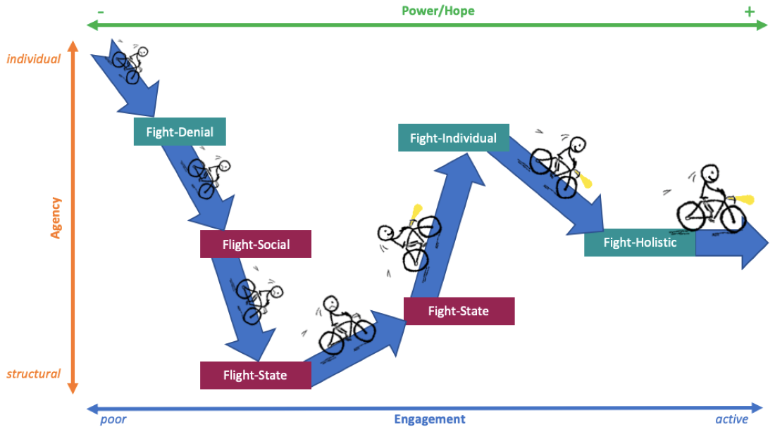 This paper presents a new engagement model for climate change education (CCE) as a result of analysing interactive digital narratives (IDNs) created during the You and CO2 Climate Change Education Programme. Young people aged 13-15 from two schools in Wales participated in three workshops, which culminated in students producing IDNs about climate change using Twine storytelling software. An inductive, grounded-theory approach informed by Bourdieusien principles of habitus and value was used to explore students’ responses to the Programme. Stage 1 coding identified ‘Core Themes’ and located student responses along tri-axial continua showing engagement, agency, and power. Stage 2 coding combined ‘Core Themes’ to build upon Cantell’s 2019 Bicycle Model of Climate Change Education to create a new ‘Holistic Engagement Model for Climate Change Education and Action’ (HEMCCEA), where learners’ journeys towards full engagement with and understanding of CCE and action could be traced. Barriers to students’ engagement with and understanding of CCE were identified through Bourdieusien analysis of responses. Results show that engagement was related to children’s views on their capacity to effect change on individual, local and governmental level. The HEMCCEA provides a model for adjusting CCE curricula to accommodate young people’s varying cultures and views.