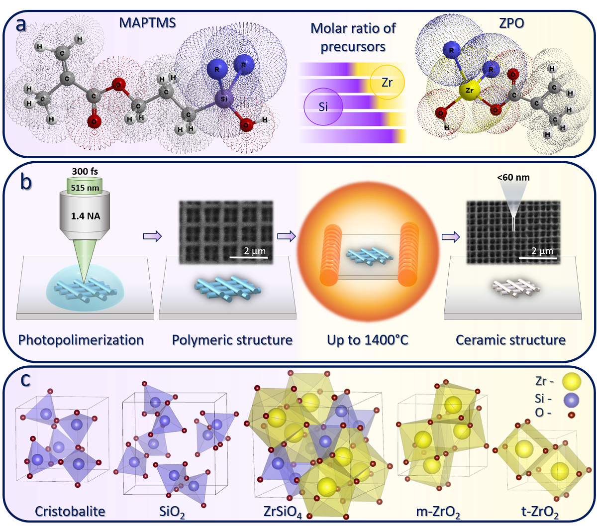 The current paper is focused on the rapidly developing field of nano-/micro three-dimensional production of inorganic materials. The fabrication method includes laserlithography of hybrid organic-inorganic materials with subsequent heat treatment lead-ing to a variety of crystalline phases in 3D structures. In this work, it was examineda series of organometallic polymer precursors with different silicon (Si) and zirconium (Zr) molar ratios, ranging from 9:1 to 5:5, prepared via sol-gel method. All mixtureswere examined for perspective used in 3D laser by manufacturing by fabricating nano-and micro-feature sized structures. Their deformation and surface morphology wereevaluated depending on chemical composition and crystallographic phase. The appear-ance of a crystalline phase was proven using single-crystal X-ray diffraction analysis,which revealed a lower crystallization temperature for microstructures compared tobulk materials. Fabricated 3D objects retain a complex geometry without any distortion after heat treatment up to 1400oC. Under the proper conditions, a zircon phase (ZrSiO4 - a highly stable material) can be observed. In addition, the highest newrecord of achieved resolution below 60 nm has been reached. The proposed prepara-tion protocol can be used to manufacture micro/nano-devices with high precision andresistance to high temperature and aggressive environment.