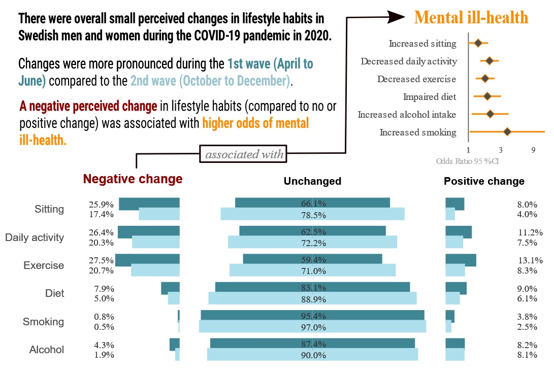 The COVID-19 pandemic has become a public health emergency of international concern, which may affect lifestyle habits and mental health. Based on national health profile assessments, this study investigates perceived changes of lifestyle habits in response to the COVID-19 pandemic and associations between perceived lifestyle changes and mental health in Swedish working adults. Among 5,599 individuals (50% women, 46.3 years), the majority reported no change (sitting 77%, daily physical activity 71%, exercise 69%, diet 87%, alcohol 90%, and smoking 97%) due to the pandemic. Changes were more pronounced during the first wave (April-June) compared to the second (October-December). Women, individuals <60 years, having a university degree, being white-collar workers and having unhealthy lifestyle habits at baseline had higher odds of changing lifestyle habits compared to their counterparts. Negative changes in lifestyle habits as well as more time in mentally passive sitting at home was associated with higher odds of mental ill-health (including health anxiety regarding one’s own and relatives’ health, generalized anxiety and depression symptoms, and concerns regarding employment and economy). The results em-phasize the need to support healthy lifestyle habits to strengthen the resilience in vulnerable groups of individuals to future viral pandemics, and prevent health inequalities in society.