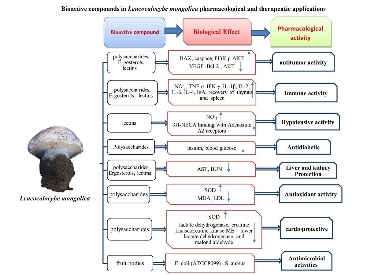 Medicinal mushrooms have got much attention from biologists in the last decades. Leucocalocybe mongolica Imai remains one of the famous clinical and edible mushrooms used in traditional Chinese medicine and Mongolian medicine to treat various diseases. It also commonly consumes in Chinese and Mongolian daily dishes. Numerous biochemical components exist in L. mongolica, especially in the fruiting bodies include; polysaccharides, sterol, lectins, laccase, amino acids, terpenes, volatile compounds, and so on. These biomedical components possess a lot of medicinal properties and provide diverse therapeutical effects for human health, such as anti-tumor activity, antiproliferative activity, anti-diabetes properties, hypotensive effect, hepatoprotective effect, antioxidant activity, cardioprotective effect, and so on. However, this review's main objectives are to illustrate some basics about the bioactive components in L. mongolica and its pharmacological effects on the human body. In addition to giving forward some suggestions for future research on this medicinal mushroom.