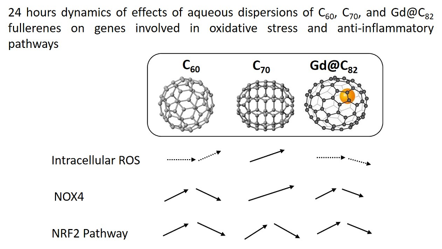Background: Fullerenes and metallofullerenes can be considered promising nanopharmaceuticals themselves and as a basis for chemical modification. As reactive oxygen species homeostasis plays a vital role in cells, the study of their effect on genes involved in oxidative stress and anti-inflammatory response is of particular importance. Methods: Human fetal lung fibroblasts were incubated with aqueous dispersions of C60, C70, and Gd@C82 in concentrations of 5 nM and 1.5 µM for 1, 3, 24, and 72 hours. Cell viability, intracellular ROS, NOX4, NFκB, PRAR-γ, NRF2, heme oxygenase 1, and NAD(P)H quinone dehydrogenase 1 expression have been studied. Results & conclusion: The aqueous dispersions of C60, C70, and Gd@C82 fullerenes are active participants in ROS homeostasis. Low and high concentrations of AFDs have similar effects. C70 was the most inert substance, C60 was the most active substance. All AFDs have both a “prooxidant” and “antioxidant” effect, but with a different balance. Gd@C82 was a substance with more pronounced antioxidant and anti-inflammatory properties, while C70 had more pronounced “prooxidant” properties.