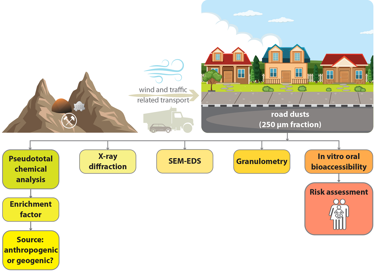 Aiming the characterization of road dusts on the surrounding villages of an active mine and to assess metal(loids) bioaccessible fractions, a dust samples survey was undertaken. To achieve these objectives, pseudototal element concentration, mineralogical composition, Enrichment factor and in vitro extraction UBM assay for both gastric (G) and gastrointestinal (GI) phases, were determined. Results obtained revealed that arsenic represents the higher risk to humans, with mean pseudototal values higher than the maximum reference value range. Enrichment factor points to As significant to very high enrichment in all villages. Particles enriched in As, Ca, Fe, Cu, Al, Ti were identified by SEM-EDS in weathered agglomerates, linked to mine wastes and long-distance transport, both by wind and/or traffic. Arsenic bioaccessibility fraction (%BAF) presents low values in the studied samples, possibly due to low Fe complexes solubility with adsorbed As, limiting arsenic release and reducing its bioaccessibility. Concentrations of Cd bioaccessible G and GI phases are within the reference values range, while for Cu are above and for Pb are lower, than reference value range. Results show that the pseudototal fraction risk is overestimated when comparing to BAF (bioaccessible fraction), nevertheless, total G and GI risk are above the carcinogenic target risk (1.00E-06) in most samples. Carcinogenic risk of the bioaccessible contaminants shows that As is the element that represents higher risk for developing cancer over a lifetime, being ingestion the main risk route.
