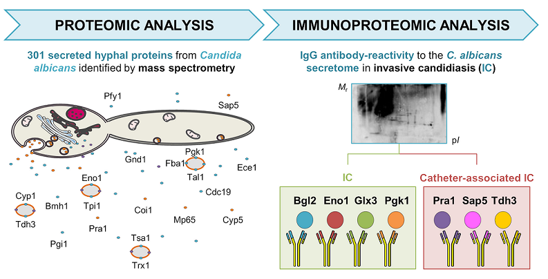 Invasive candidiasis (IC) is associated with high morbidity and mortality in hospitalized patients if not diagnosed early. Long-term use of central venous catheters is a predisposing factor for IC. Hyphal forms of Candida albicans (the major etiological agent of IC) are related to invasion of host tissues. The secreted proteins of hyphae are involved in virulence, host interaction, immune response, and immune evasion. To identify IC diagnostic biomarker candidates, we characterized the C. albicans hyphal secretome by gel-free proteomic analysis, and further assessed the antibody-reactivity patterns to this subproteome in serum pools from 12 patients with non-catheter-associated IC (ncIC), 11 patients with catheter-associated IC (cIC), and 11 non-IC patients. We identified 301 secreted hyphal proteins stratified to stem from the extracellular region, cell wall, cell surface, or intracellular compartments. ncIC and cIC patients had higher antibody levels to the hyphal secretome than non-IC patients. Seven secreted hyphal proteins were identified to be immunogenic (Bgl2, Eno1, Pgk1, Glx3, Sap5, Pra1 and Tdh3). Antibody-reactivity patterns to Bgl2, Eno1, Pgk1 and Glx3 discriminated IC patients from non-IC patients, while those to Sap5, Pra1 and Tdh3 differentiated between cIC and non-IC patients. These proteins may be useful for development of future IC diagnostic tests.